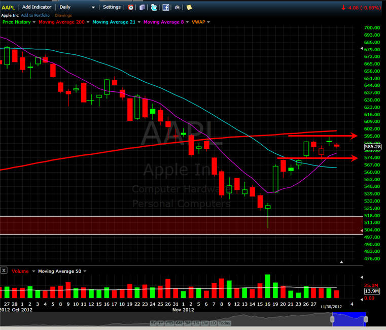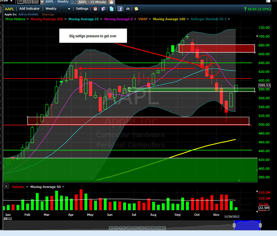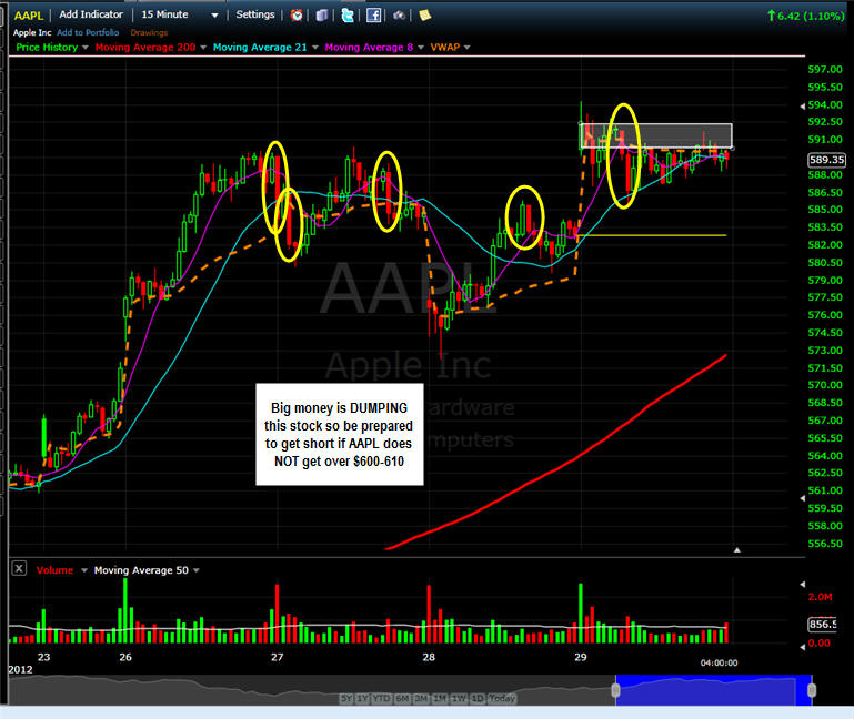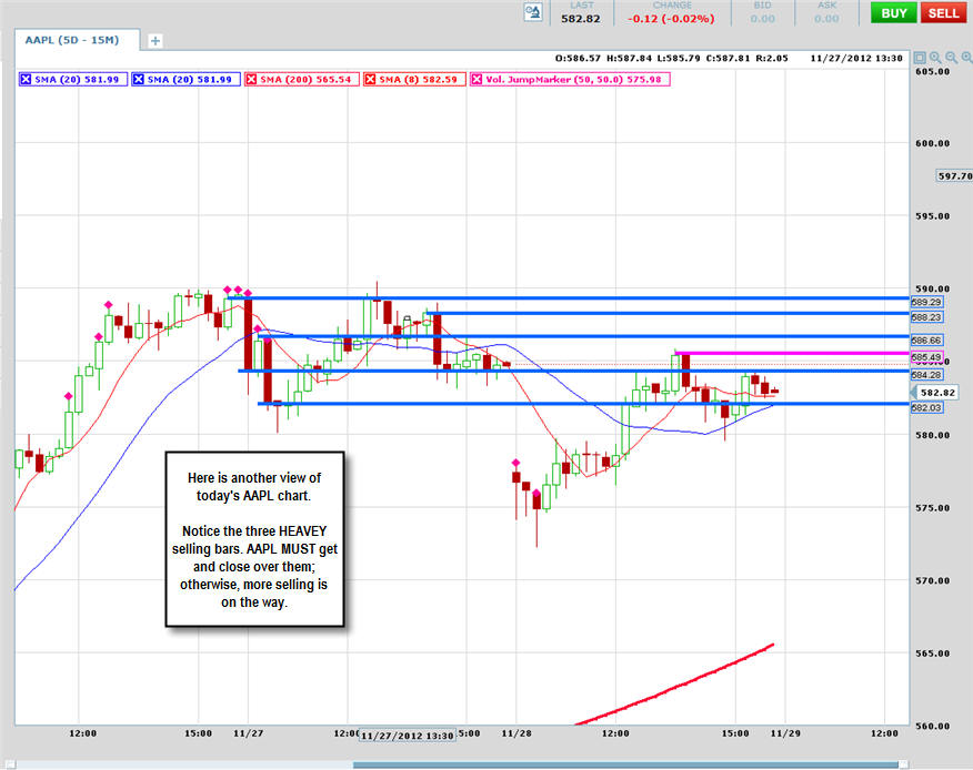 The donFranko ================================================================================ 11/27/12 - No follow through from yesterday. See, I told you when Citi gets on board with upgrades, it's time to start looking for shorts—probably not the case, but just my suspicious nature at work...lol Ok, so what is in store for the AAPL? Everyone says it's a screaming buy, but some are still saying it's only a relief rally and there is more reason to go DOWN in the short term....a technical chart reason. Stocks like AAPL tend to buck the chart trends for a while in the short-term, and with month end coming Friday, I suspect AAPL will take a breather the rest of the week and then get it's mojo on for the hopeful Santa Clause Rally. Only this time, there is a real "Fiscal-Clause" in the future for the markets. It's the Fiscal Cliff and if things do not get fixed before year end, we could see old Santa getting stuck in the north pole vs. brining us lots of gifts, goodies and Apple treats! What I did notice today is AAPL did not move higher at the open and started to immediately sell off for the first 15 minutes. It did rally right back and eventually touched on $590 before selling off the rest of the afternoon. What was interesting to me is the stock traded the entire day inside the first 15 minute bar and closed right at that 15 minute bars closing price too. I am still bearish tomorrow since AAPL closed the day under VWAP. We could still see a rally in the stock back to $600-610 if the markets rally, so I will be looking for a Lotto Play on Friday with this stock.