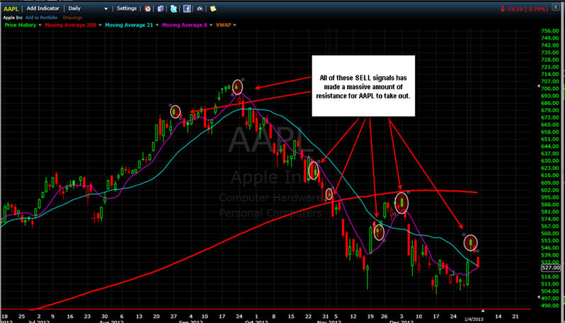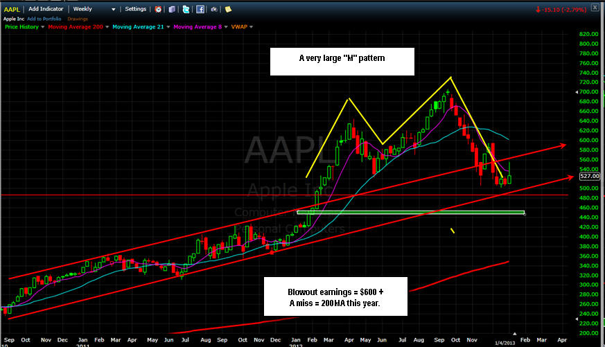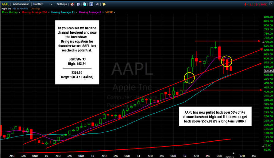 ==================================================================================== 1/6/13 - There has been no love for the AAPL after it tested $555.00. In fact, it has now been left by the wayside as investors move money to stocks like FB and GOOG. This stock is BROKEN and me be beyond repair unless they massively beat earnings this time around. As I have said before, once a stock starts to raise its dividend, that usually means the massive growth curve is going to slow and although AAPL is and will be a darling stock, it will NOT have the price growth it has experienced in the past few years unless it can beat earnings estimates and continue to innovate with products that have massive appeal. The daily chart clearly shows me this stock has and is being heavily sold off but not dumped. That means to me the big money is shifting speculation gears out of this stock and any moves to the upside or downside will be controlled except for earnings releases. With the next release scheduled for Jan 23, we may not even see the typical earnings run up like previous quarters. I know that this week will be a pivotal one based on the daily chart and I am optimistic that AAPL will make that earnings run; however, if they do not handily beat estimates this stock is going to definitely see sub $500 and I will have my Lotto puts ready.