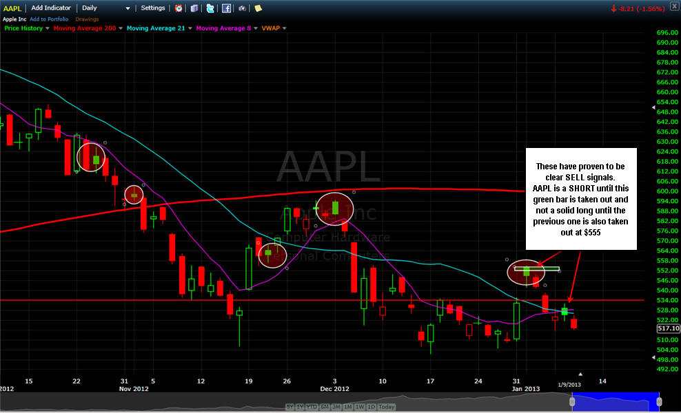 1/9/13 - I have been scalping AAPL with puts and today it started to drop off into the close showing more and more weakness. The daily chart put in yet another Bear green reversal bar which has prove to be a very effective short signal. Because there have been so many of them, I am getting less confident they will continue to perform, but until that signal fails I will trust it with less contracts. AAPL is losing iits love as I predicted and GOOG and FB are holding ground with FB really putting on some big moves!