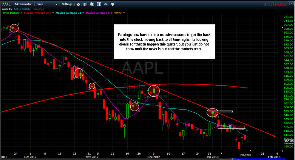 ================================================================================================================== 1/20/13 - Tuesday is the much anticipated earnings release for AAPL! Will they beat or miss again? If you look at a weekly chart, you would say NO WAY would I buy that...what a disaster! Well, that is what makes the most profitable trading opportunities on high beta stocks—a massive short squeeze! Now before you get all frothy at the thought of killing it with AAPL, you have to be sure it does not kill your bankroll. The ONLY way a stock of this magnitude can move around $15 - $30 a day is when institutional investors are buying or flat out dumping it; and based on the past 7 weeks of trading you have to say they have left the building! I am still hoping for a massive short squeeze myself so I am going to overweight my plays with calls. We know this stock is massively damaged goods, and so do the market makers, so that means puts are well priced in with premium and that means you cannot make nearly the profits a short squeeze can bring you. That is why I suggest you get close to the money 4% away from tomorrows close and go no further than 8% OTM on the calls for the lotto plays. Note: I would not buy further out than $550 because $555 was a strong reversal point off the last chance rally, but if you want to really gamble, then you can pick up some $580's If they miss, then the 200MA on the weekly chart is the target; and that is all the way down to $372.00. There are still accolades for AAPL to hit $800-$1,000 and that could very well happen, but it will take a really strong beat, big news like an increased dividend or split and the release of Apple TV this year to keep the buying pressure and frenzy going. Looking over the Feb options I see there is a HUGE amount of open interest at the 550 there is (24,807) and again at the $600 strike price (54,065). There is hardly any open interest on the puts side by comparison. This is an indication that big money knows something, so there definitely will be a massive short covering rally if AAPL does beat. Trading on Friday was controlled as AAPL dipped under $500 again, but was driven back up to a pegged close at $500—this is a signal in my mind to get long. For this weeks options, the strike with the most open interest is the $550's with 16,287 and there is where the battle will be if we get that rally because Feb also has heavy open interest there too. I am getting long calls at the open tomorrow and will pick up puts on Wed by the close of trading. I will buy a couple of puts tomorrow just in case GOOG is a disaster and that will possibly have impact on AAPL.