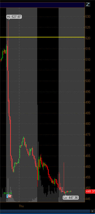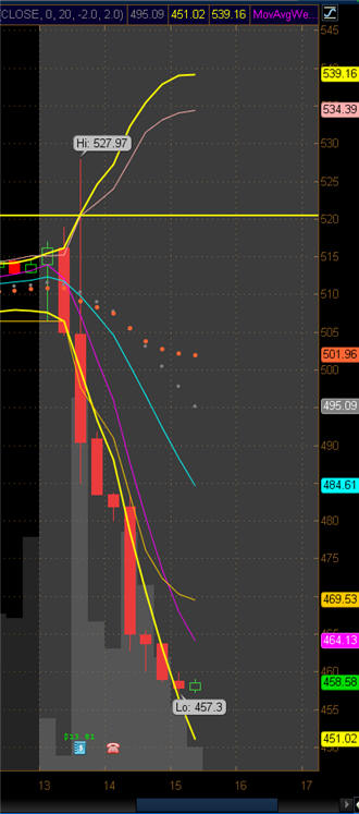 1/24/12 - The deluge keeps coming for AAPL. Will there be some relief tomorrow? Well, in after hours trading AAPL slipped to a new day LOW of $447.36 and now there are accolades it will drop to $400 over the next month. I know that once it finds a footing, there will be very apprehensive lift in price with people ready to dump at any turn so I will definitely have puts in place on any rise.