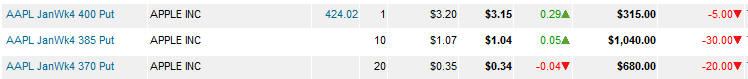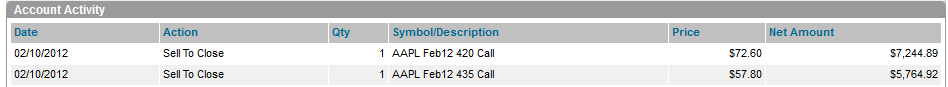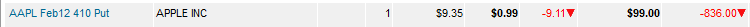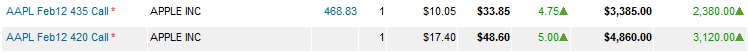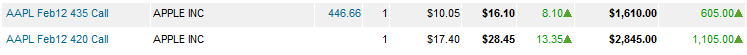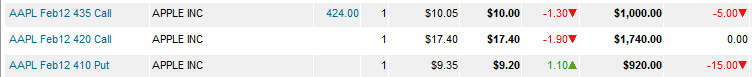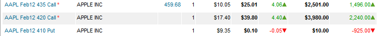 ==================================================================================================== 1/25/12 - Apple had a flat day after the big jump from yesterday's earnings surprise. This might be a good sign the stock will start another leg up as the year rolls out. My put plays are a bust by my call plays are taking up the slack.