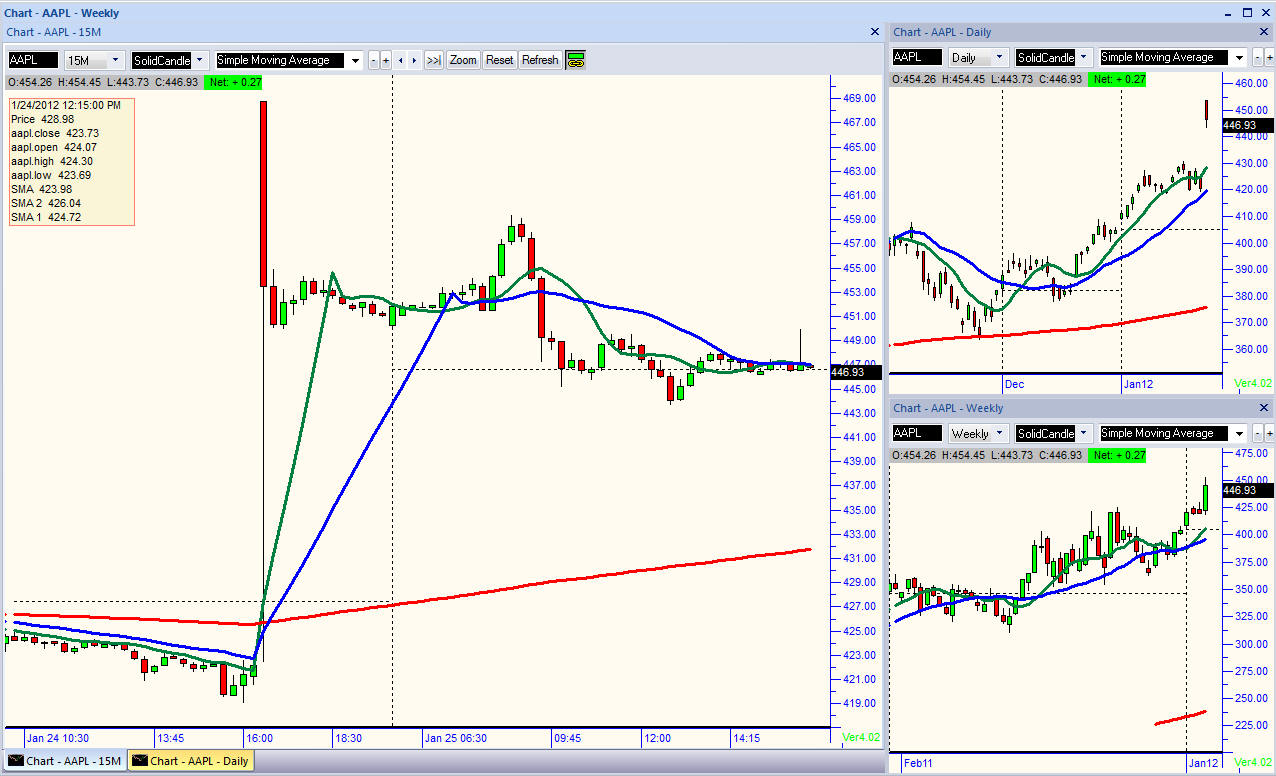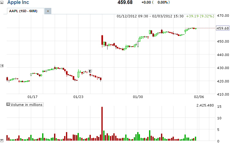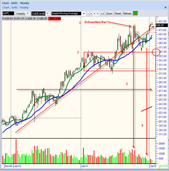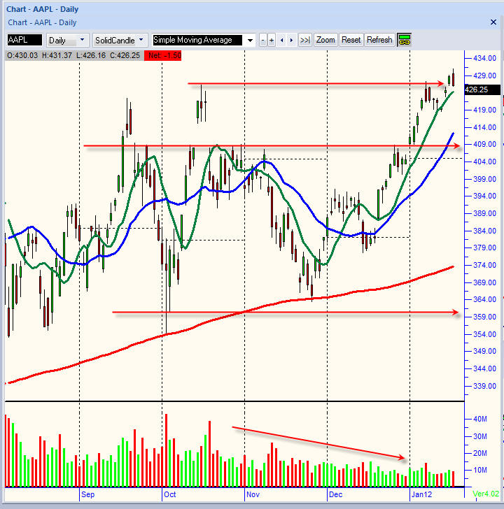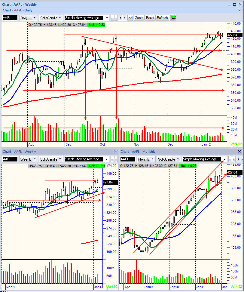 ====================================================================================== 1/20/12 Apple Earnings are coming next week on the 24th after the market closes. Will they be able to beat estimates of 10.03 per share or disappoint like GOOG did today? GOOG's earnings could be a clue to things to come since they are losing revenue and over spending. Will Apple suffer the same drastic price drop? Well, I certainly hope APPL has a big move in either direction. I believe this quarter will be given a lot of "grace" if they miss since its the first full quarter after the death of Steven Jobs. A lot of investors will be hoping the reigns of the company transferred into competent hands before they continue to buy up shares at these very expensive prices—Apple is a VERY loved company, and people will buy and buy some more long into any bad news just because, its Apple! Last quarter AAPL came up short of estimates, but that did not slow down the stock one bit. In fact, they hit a new all time high of $431.37 today before profit taking came into play ahead of big earning announcement from other tech companies. Looking over some of their comrades in tech: IBM had a good quarter easily surpassing Wall Street forecasts. Sales were just below analysts' expectations mainly due to a slowdown in mainframe sales. In after hours the stock traded over $5 higher. MSFT which beat estimates, but that was primarily based on Xbox games sales over the Christmas Holiday season. The stock traded higher in after hours but not enough to get excited about. INTC also beat estimates and sees its revenues rising this year in the "high single digits" based on a percentage basis. They are making more and more chips and a lot of those chips end up in Apple's computers which can be an insight to the future of the Apple. However, looking over some of the comments about Intel's conference call, it appears they are doing more "chip" business with smart phone and laptop style computers and Apple does not use Intel chips in their iPhones or iPads...hmmm...that could be a clue that PC sales are not going to be as strong which means profits are going to be lower which means the stocks price will head LOWER. Question is, will that be after this earnings release or later down the road? Looking over the charts we may be able to see some clues: