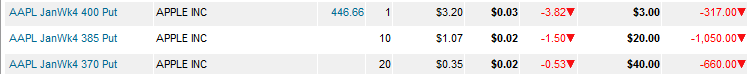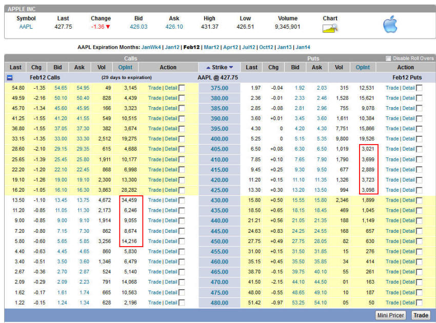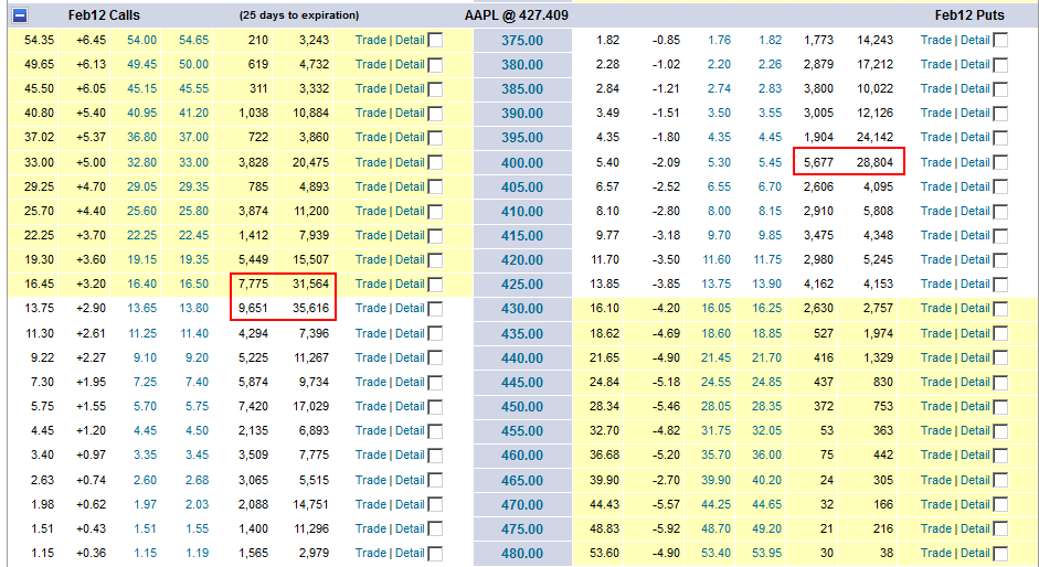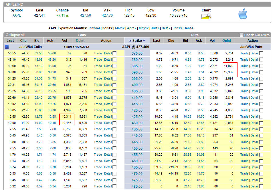 1/24/12 - APPLE kicks butt and beats by a wide margin. The stock rockets up in after hours and the potential for continued growth is looking good? I am not so sure they can "sustain" these lofty prices as competition keeps coming with same technology and much lower prices. Eventually, consumers will look at their wallets instead of being "popular" and besides, there are just too many analysts touting this stock as a long, so I am a big time contrarian and will just bide my time for put opportunities. As you can see in post market trading, there is NO conviction in the initial gap up and instead, the stock is selling off. If the stock does not take out $470 tomorrow, then its a short for now. Remember, this quarter is the last under the leadership of Jobs, so going forward there will be a substantial amount of scrutiny on the the new management in the future quarters. If these prices hold up tomorrow, I should get a break even on all my plays. If they hold $450 Apple will have the largest market cap of all stocks in the market...WOW! ==================================================================================================== 1/23/12 - Tomorrow is the big day for Apple. Earnings are due out after the bell so the volatility tomorrow could be interesting. Today the stock did put on a good day to the upside with decent volume. Could this be the sign of things to come? Let's look into the details and see if we can find some profit opportunities. Typically stocks traded on the S&P 500 move around 10% at earnings announcements unless there are other circumstances to make a greater impact on the stock—e.g. large short interest, split announcement, very unexpected news, strong market movement in conjunction etc. Looking over this chart below we can see that Apple has had quite a nice run up on price heading into this earnings announcement. Notice how today's action stopped short of closing at the high from last quarters earnings; however, the patterns is looking more bullish this time. Because Apple put in a new all time high last week, we may be in for a "party" rally on any good news, and a new uptrend on strong earnings, but if they miss, I think this stock could see more than a 10% drop. So, upside price targets would be $465-$470 and downside $400 to $380.00 with really bad news driving price down to $350 or even lower depending on sentiment and market conditions. Next we will look at today's closing options prices for clues where the money is heading: On weekly options there is a lot of volume at the $425-430 calls and $485-390 Puts On the Monthly There was a lot of puts bought at the $400 Strike. As you can see, there is a lot of premium pumped into these options so you are going to be "gambling" with any of these picks if you play Apple earnings tomorrow. This time I am going to spread my plays out to help me better cover my risk and if the stock gets whacked then my "lotto" DOTM puts will be icing on the profits cake.