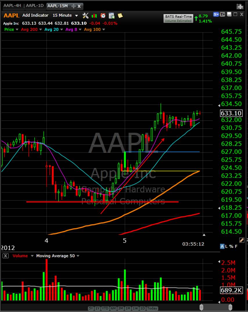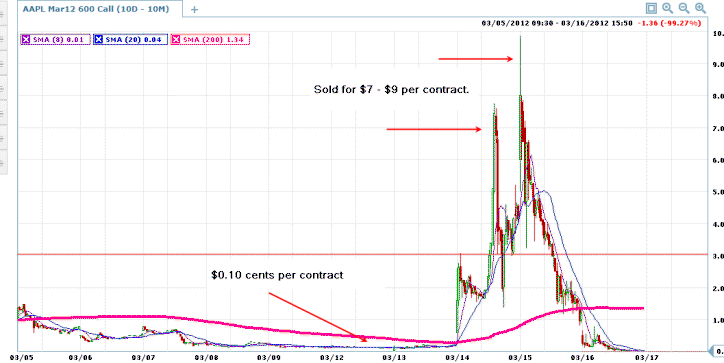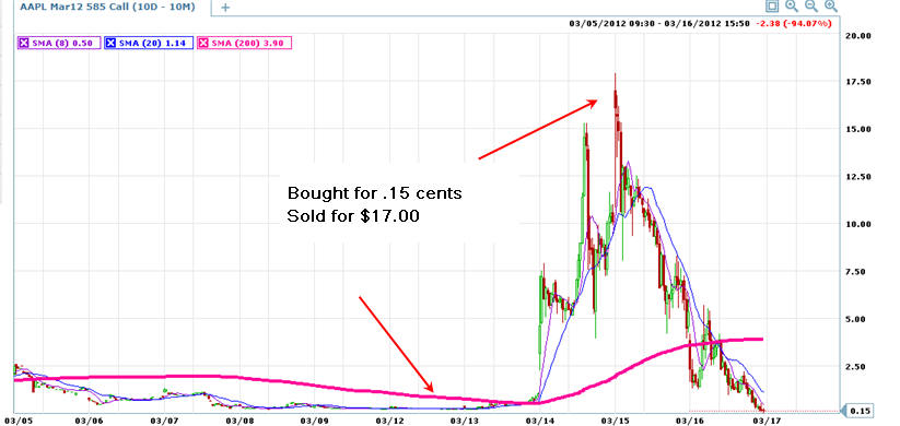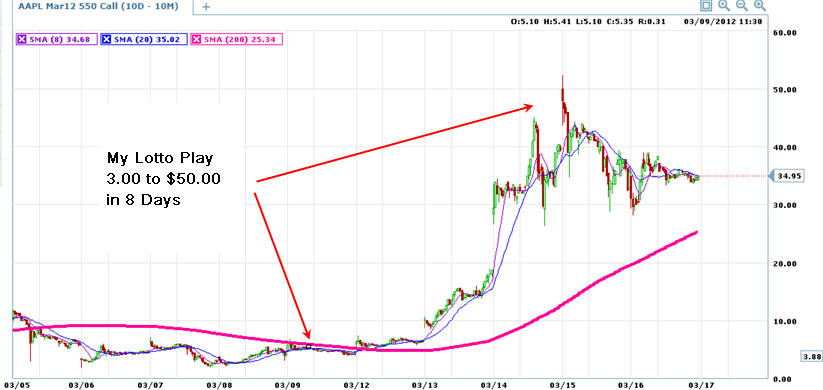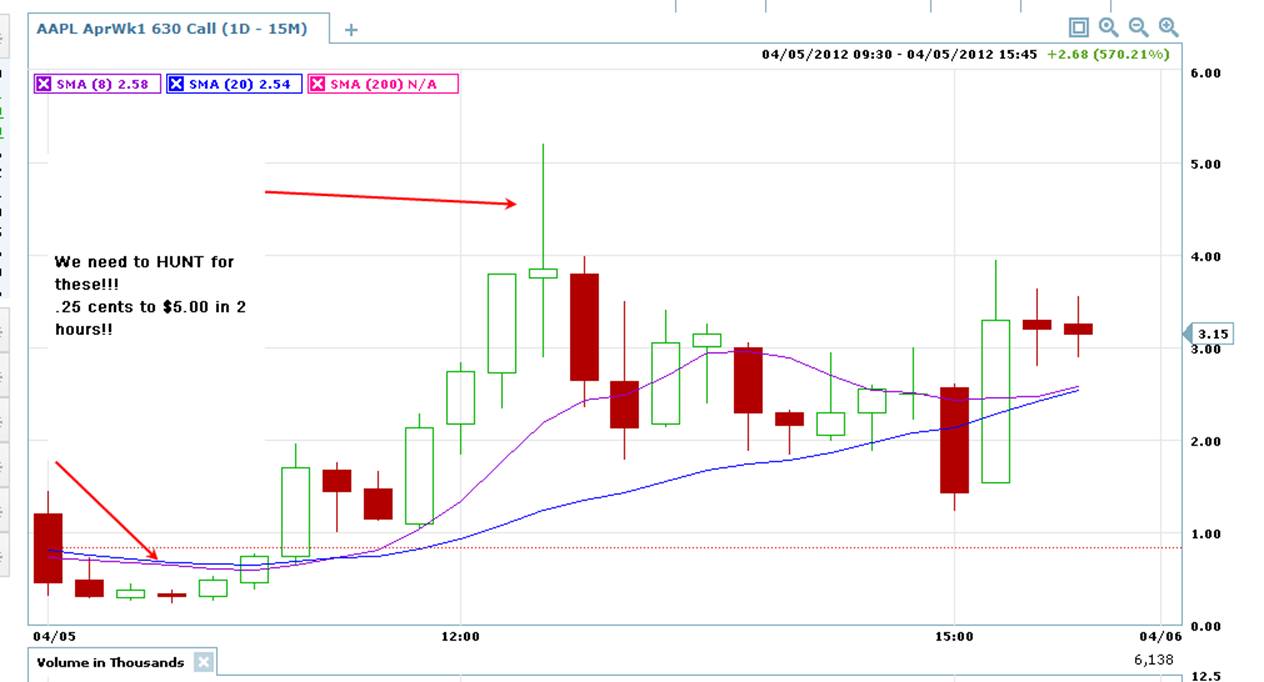 There will be MORE opportunities for this type of quick returns as AAPL continues to make moves higher. When this stock decides to take profits, there will be a very large potential to make MORE profits with Puts too! =============================================================================================================== 4/6/12 Getting opportunities to trade Apple for massive quick profits seems to be a daily occurrence for now. By trading weekly options, you can catch some massive moves and make huge profits! I have been watching Apple for the past couple of weeks and noticed there was huge potential to make big profits trading these weekly options. Today, I found a huge one I want to show you. APPL was languishing for a couple of trading days, but what I noticed was every time there was a dip in the stock, it was bought up with enthusiasm and the short-term weekly option made spectacular moves! Here is yet another one that could make you MASSIVE profits this week!