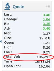Even if you did large contract loads, there would be NO PROBLEM GETTING FILLED TODAY with over 100k contracts traded!! I am pretty sure, however, if you were doing anything over 100 contracts, you would most likely have to layer your orders with Limits to assure you would get filled. The best strategy is to make you buys and then immediately put on your staggered orders to sell. That way, when the stock makes its move, you are already in line to sell to the novice investors who always act late—been there was that...lol.