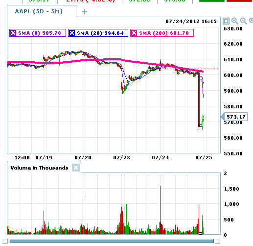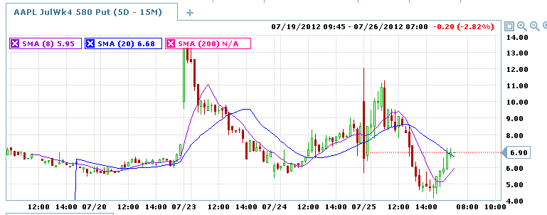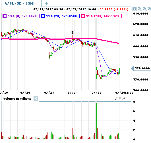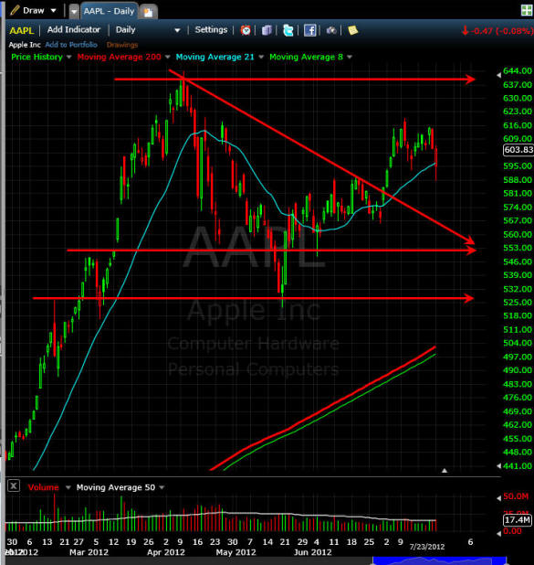 =========================================================================== 7/24/12 - AAPL MISSED earnings on both EPS and revenue — OUCH! The stock took a hit in after hours, but seems to be holding up much better than any other stock would with these numbers. I venture to say this stock has a whole lotta love and investors look at this as a buying opportunity. Of course with the dividend coming, that will put the breaks on for a short period of time, but if they continue to miss (now two quarters in a row) then investors will definitely take profits off the table in a very big way. As I suspected yesterday, the trades on this stock were most likely NOT going to be profitable, so I hope you did a small contract load as suggested. The 580 puts might end up making some profits on the weekly trades, but I do not expect it to be big enough to pay for the losses this time around. I will be looking for opportunities to capture longer term moves and make up these trades that did not work out today.