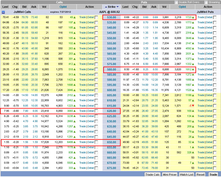 The weekly chart shows you there has been two weeks of indecision; however, the volume was light so, when the trend is set, it's gong to be a big move in either direction. Next we are looking over the options. On the call side, there is quite a bit of open interest on the 610's (6,140) and the 620's (5,785). This is the battle ground upside targets. The premium you will pay to be $20 OTM is $8.75, so that means the stock must trade at $30 or higher by this Friday to make you a profit. It certainly can, but wow, that's a lot of money to lay for a relatively small return. By comparison, the puts open interest is less than half, so you know everyone is looking for this stock to move much higher. Of course I am going to straddle it, and if they miss, its going to be a very profitable play on the put side. If you are not willing to gamble on weekly options, then the Aug 620's are asking $14.60 which means AAPL must trade above $635 by Aug expiration. Now it certainly can achieve that over the next four weeks if there is market support etc. On the put side, the $550's have a whopping 14,216 contracts in open interest. No matter what directions or strike you look at, the price to play is expensive, so make sure you can afford a total loss if this stock does not move...it can happen. This is why I like to do my Day Trading strategy for making easy profits to pay for the Lotto speculation plays. That way, I can lay a lot of nets and not worry about the fish that get away because I know I will be catching several White Whales over the trading year! Learn how to hit the Options Lottery here.