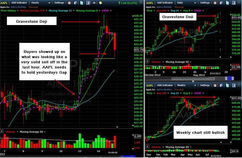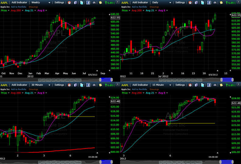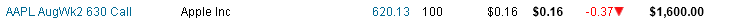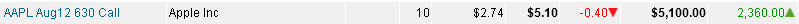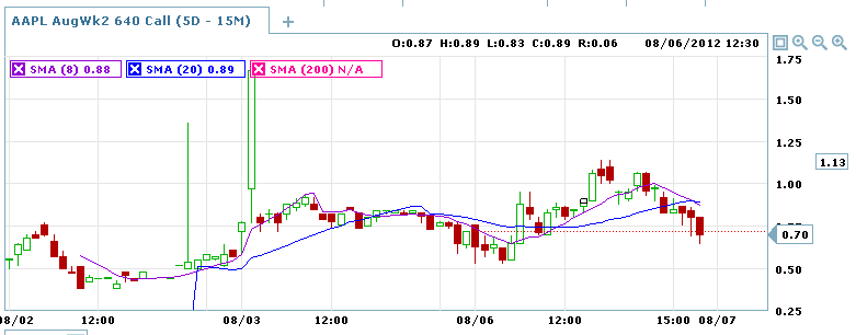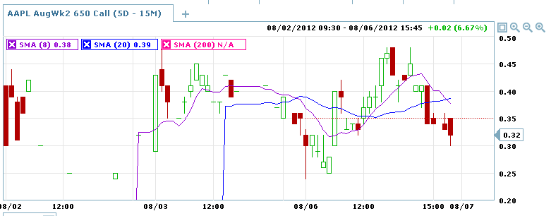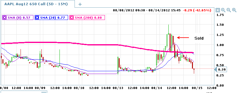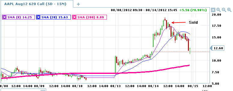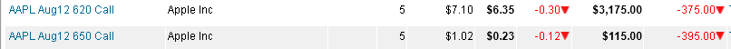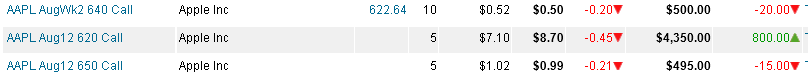 =============================================================================== 8/10/12 - The weekly plays expired today ;-( Time to go fishing for the next one....stay tuned! Still have the Aug calls: ================================================================================ 8/9/12 - added more This is completely speculation because there is no current news, earnings announcements or market news to go by. I am just basing my decision solely off the charts looking for a Friday rally, so, if you follow this trade, do so knowing its a 99% potential losing trade. Note: I do NOT recommend you buy 100 contracts as I have shown, unless you have a very large account and can easily absorb a complete loss. If this is your first few trades with me, just start with 1-2 contracts and build up more when I find you winning trades. ======================================================================== 8/7/12 - Here are my trades on AAPL ============================================================================= 8/6/12 - With all the positive news, momentum and future compelling events on AAPL, this stock is looking poised to put in a new all time high this week! Tomorrow I will pick up some of the Weekly 640's or 650's depending on how the stock opens.
