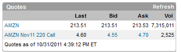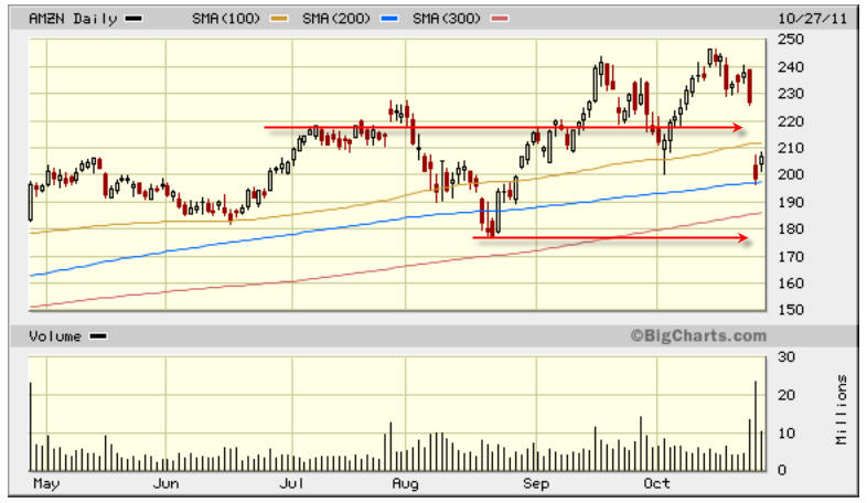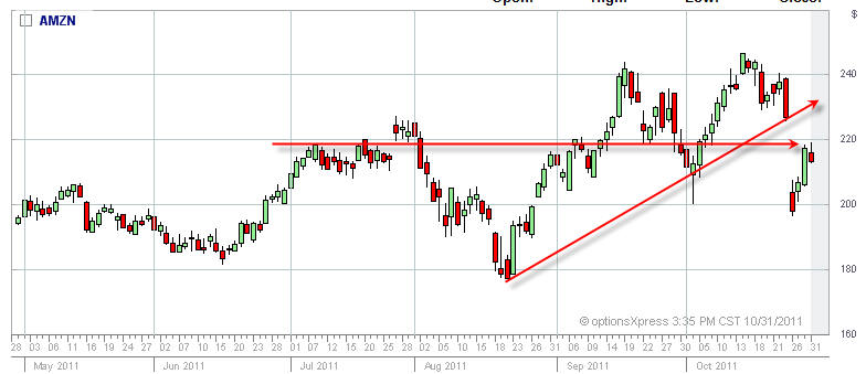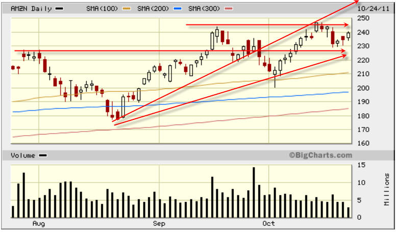 ==================================================================================================== Things are looking very good for a bust out long play on AMZN, but last quarter the chart looked the same and the stock was sold off for a couple of days. I am doing a straddle on this one, but I am optimistic AMZN keeps on trucking higher; especially with the holiday shopping season coming and the ever increasing online purchases is making this company potentially the biggest retailer EVER.