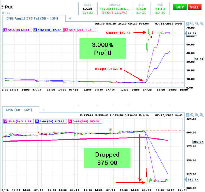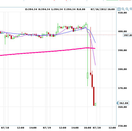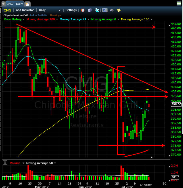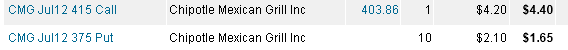 ============================================================================== 7/19/12 - Wow, nice drop in after hours trading. CMG came up short on revenue which is a disaster for upside potential. The selling will continue on this one over the next couple of weeks to months. Questions is, will it continue tomorrow so my puts can make a HUGE profit!