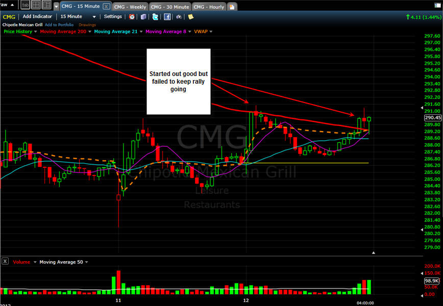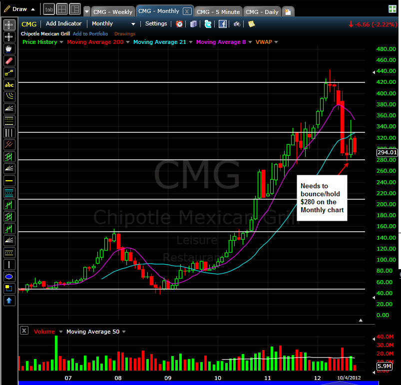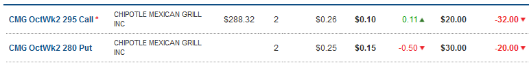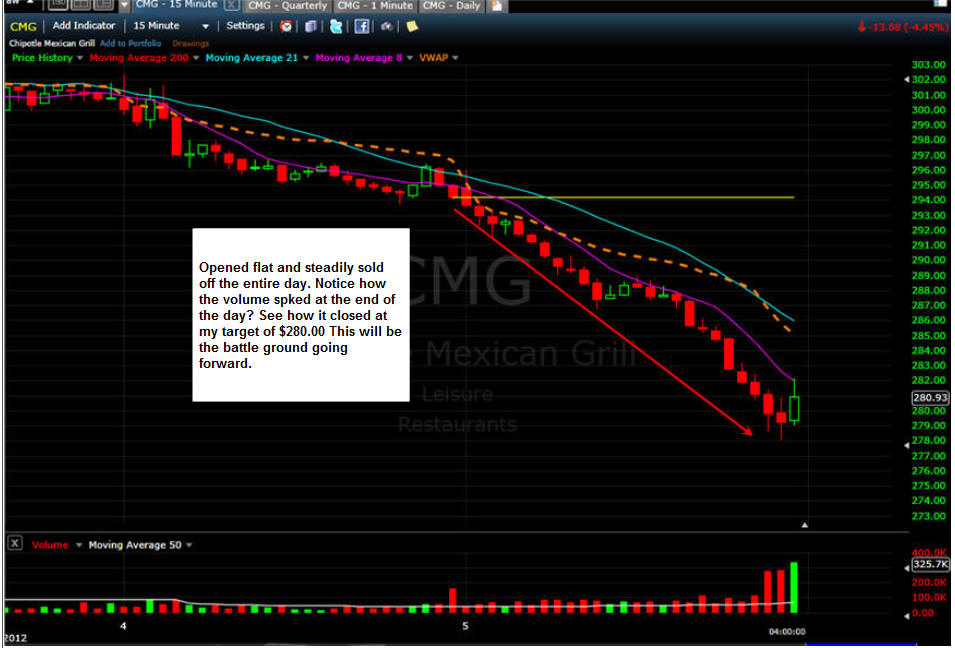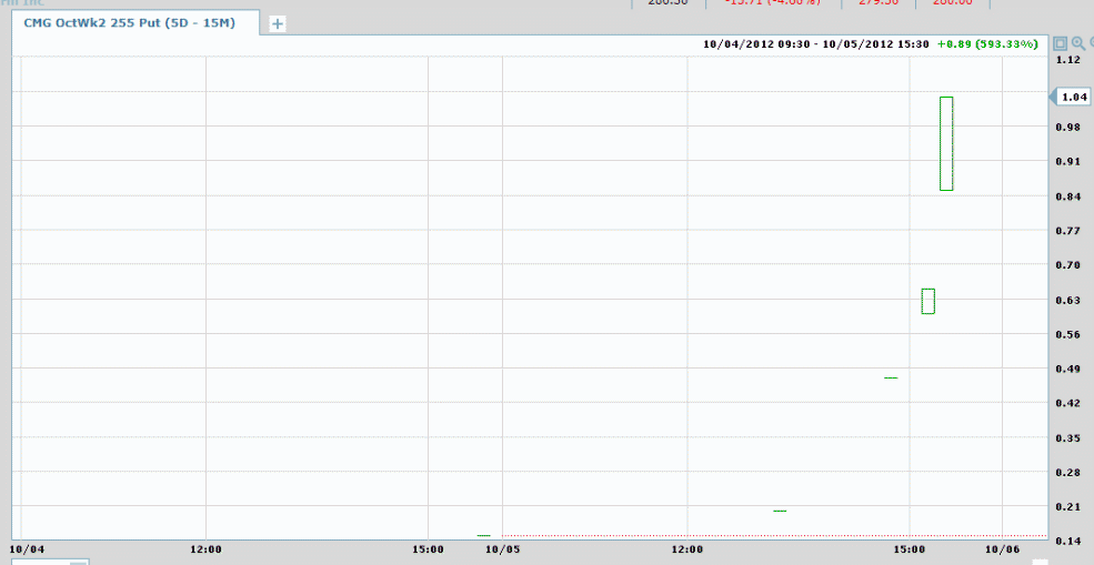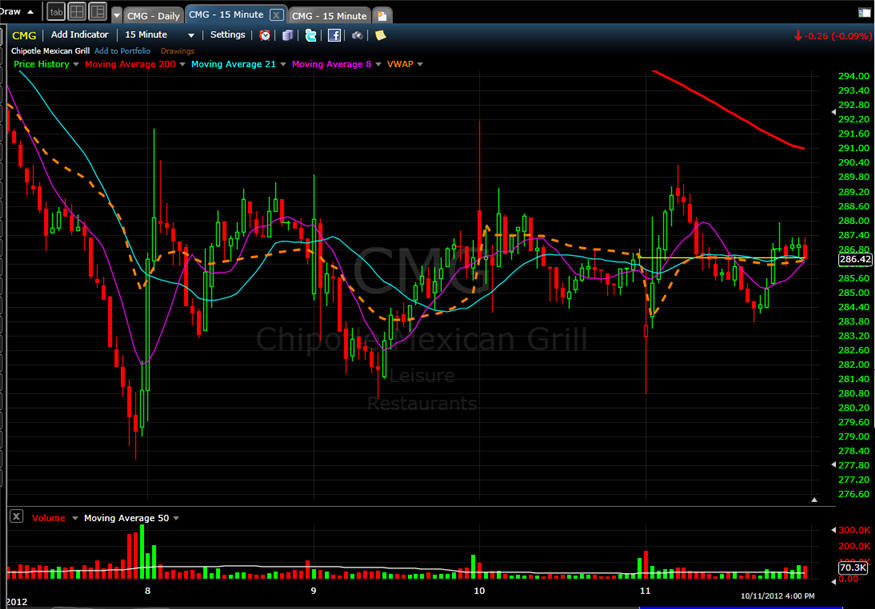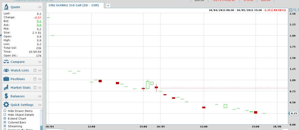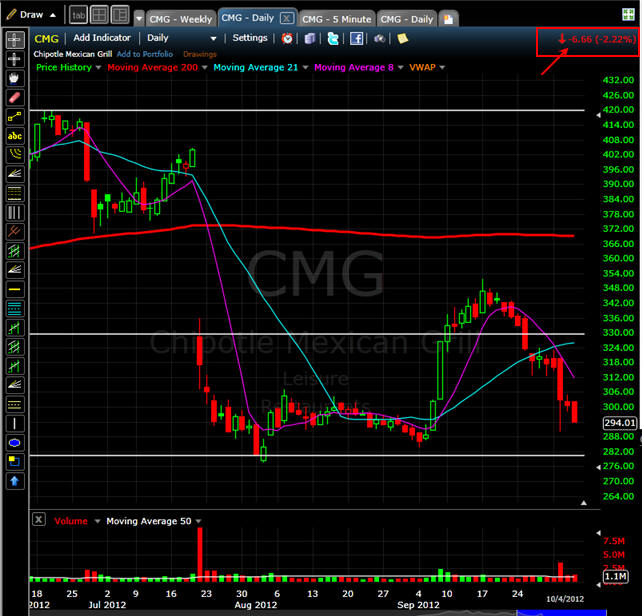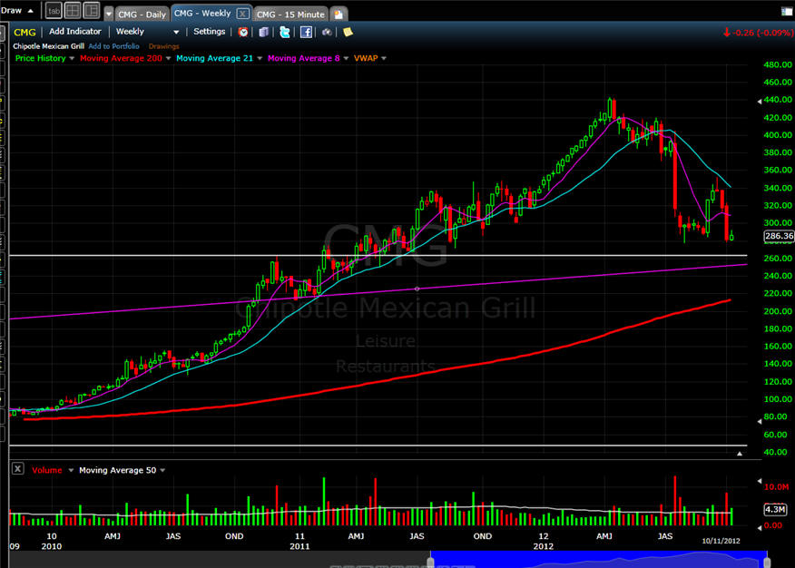 9/12/12- Bought my two positions at the open: Unfortunately CMG could not keep the morning momentum going and these trades are now expired. Next week is earnings so I am hopeful there will be a big move in either direction.