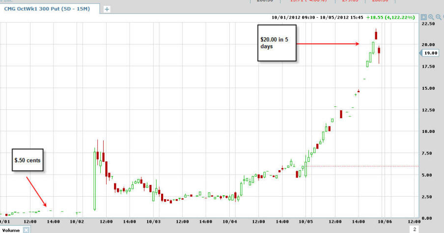 This was the $300 Weekly put chart. You could have bought on 10/1/12 for $.50 cents and had you held to today your profits would have been $20.00 or 5,000% ROI off a $40 drop!!! The KEY to this is picking a strike price that will be In-The-Money (ITM) by Friday. Trading options (especially puts) around benchmark prices like $300, $200, $100 etc. can get you a very nice profit when the stock sells off! I am on the hunt for the next winner like this one became!! Here is the chart for the OctWk2 $310 Calls. These options can be bought for $0.25 cents per contract today. I will pick up a couple of them on Monday and lets see if CMG can recover all of this weeks losses. There was 236 contracts traded today and open interest is 174. If CMG can rally back up 10-15% next week, these could be worth $10 - $20.