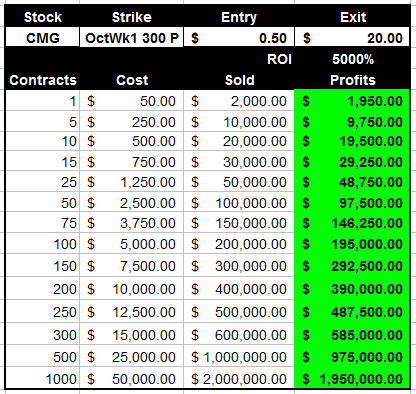 Now if the selling continues, I would say CMG could fall another 10% before it finds major support around $250 - $240 so here are the OctWk2 255 Puts currently at $1.00 per contact