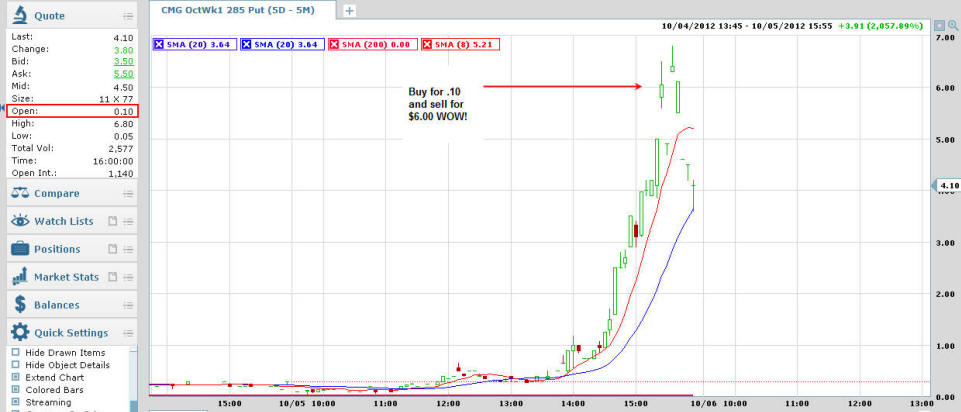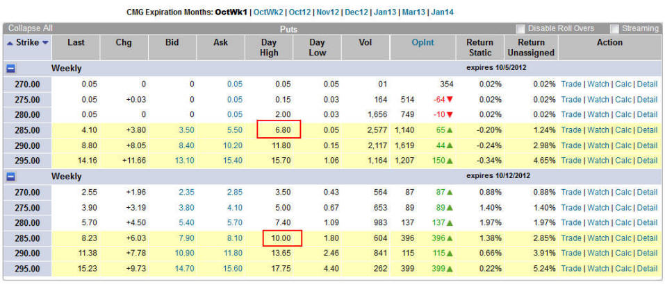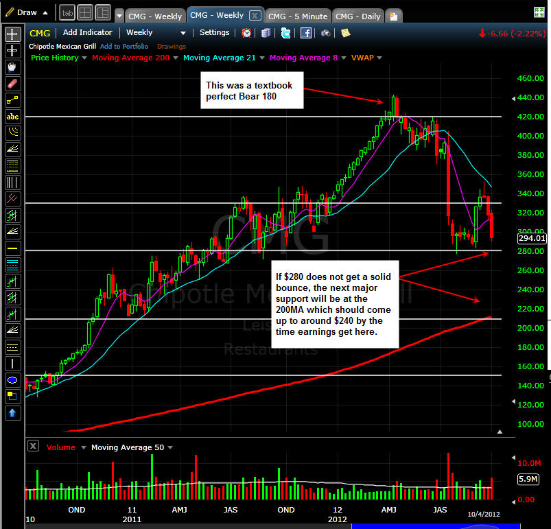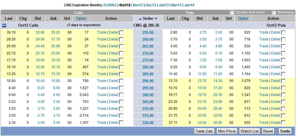 ============================================================================================ 9/11/12- Ready to eat at the profits trough? Next week will be a highly anticipated earnings release on Thursday. If CMG beats in a big way, then the shorts are sure to cover and we could have another MASSIVE winner here at OptionRadio.com!!! With all the negative, news, downgrades, short sellers and negative-commentators, CMG is poised to teach 'em all a lesson...or will it be a case of earnings poisoning and the woodshed will be teaching the lesson. with YUM kicking in a good quarter, it sprang some hope back into the stock that was quickly sold the past couple of days; however, volume was only average, so there are still some buyers lurking about. With the stock now testing the support at $280 for the third time, this stock must beat or it will be beat down down and down some more. There appears to be more long bias on the calls for next week.