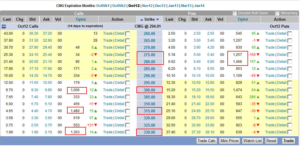 ==================================================================================================== 9/4/12 - I have been watching CMG since I stopped out of it a week ago. This stock received a negative news report and downgrade by an influential short seller David Einhorn said the valuation of CMG is just outrageous. He said it was way over valued and to SELL it SHORT. This caused the recovery rally that was under way and now the stock has headed back to the bottom of the barrel. Today's close at $294.01 which happened to be down ($6.66). What a very interesting number to be down and what's with the .01 penny close? All this is looking to be very fishy to me. In all my years of trading and watching stocks, I have to say that when you get oddball pricing like this, that is definitely somebody "telling" someone something. Can I confirm that? Of course not, but I am merely pointing out this is not typical. So how can we determine if it's a hidden message? Well, the best way I know is to watch the options open interest. Of course, once this stock plays out, we will be able to look back at this days close and say, yup, I knew it! Looking over the options, we can see there is definitely some speculation that CMG will head back over $315-$330 but will it happen? Well, this is still a much loved company by the hedge fund manager types, and the company is still on the grow, so it certainly could be a possibility. Earnings are coming out on 10/18/12 which happens to be the day before Oct expiration, so if they miss or surprise, we stand a very good chance to make a huge profit on Friday the 19th!