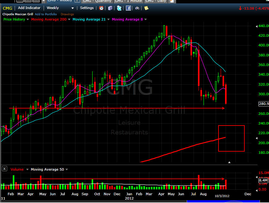 climbing With 4.8 days to cover, a blowout will bring a HUGE move on Friday. With a miss then look out below for the rest of the year. I plan on getting a straddle on next week and picking up a Nov put in case they miss, which is expected across the financial commentary I have reading. Oh but this type of crowd psychology is what makes for the White Whale trades! The daily chart is showing more downside potential coming, espeically if CMG closes under the Hammer from 8/3/12 at $277.00 with a target price at the 200MA.
