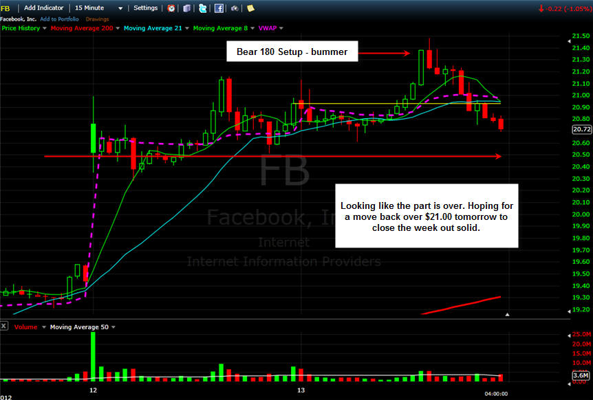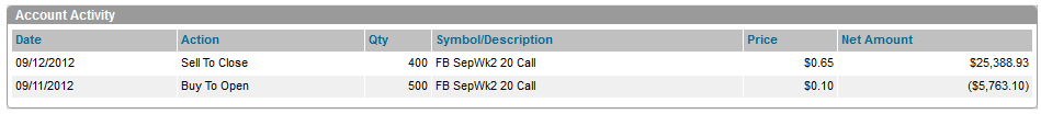 ============================================================================================= 9/13/12 - The party may be over for this week. If FB does not move higher in the morning, I will close out my trade.