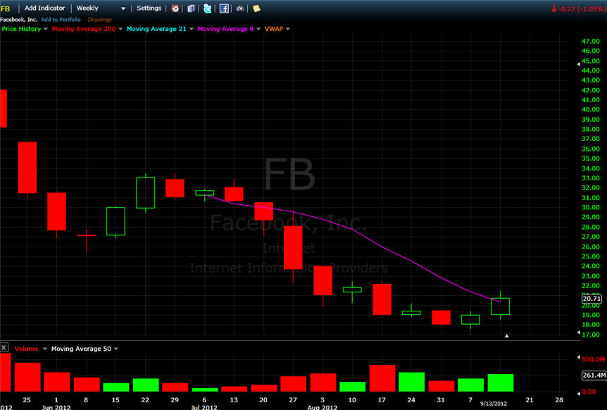 ==================================================================================== 9/11/12 - Face Book (FB) is potentially on the move tomorrow after the first comments from CEO Mark Zuckerberg tonight. This could be an explosive short covering rally I have been looking for. I am taking a shot with the Weekly 20 Calls I picked up for .10 cents per contact.