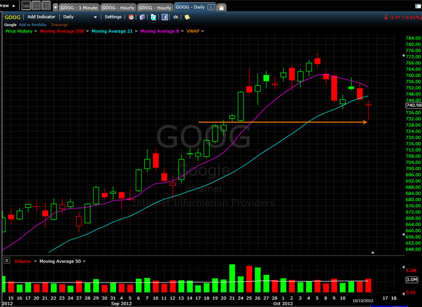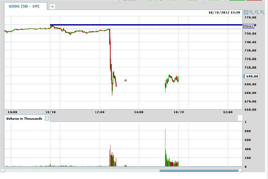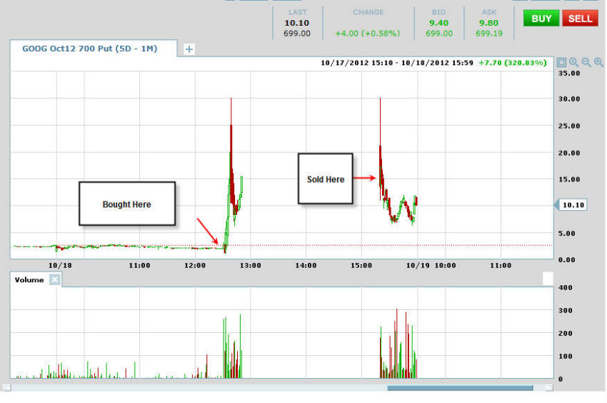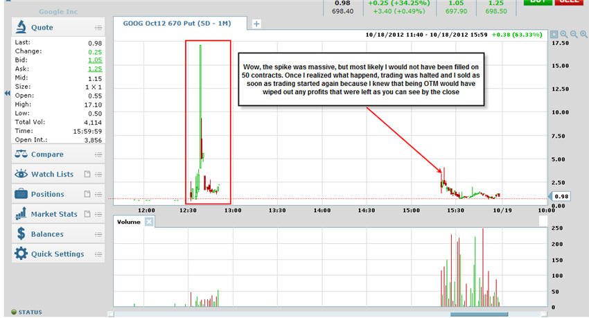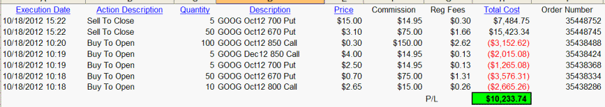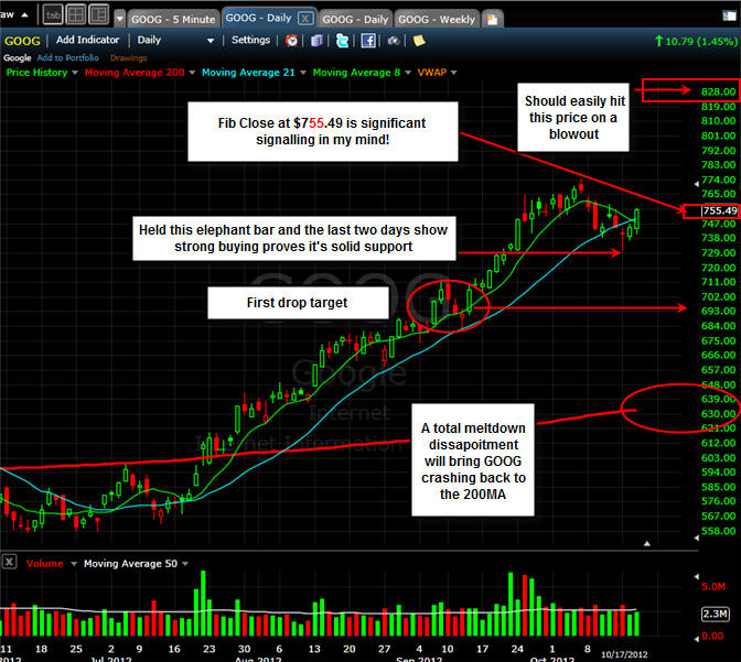 10/18/12 - I have seen a lot of crazy stuff in my years of trading, but what happened today with GOOG is one for the "seen it all" record books. WOW, I sure am glad I put on my trades this morning, but really bummed out if my subscribers were waiting until the close of trading. As you know, anything can and will happen in the trading world, but this was a sad disaster. Had the earnings came out after the bell, then the trades I had posted would have made a lot more money. I took profits off the table today and 100% of all my calls are paid for!
