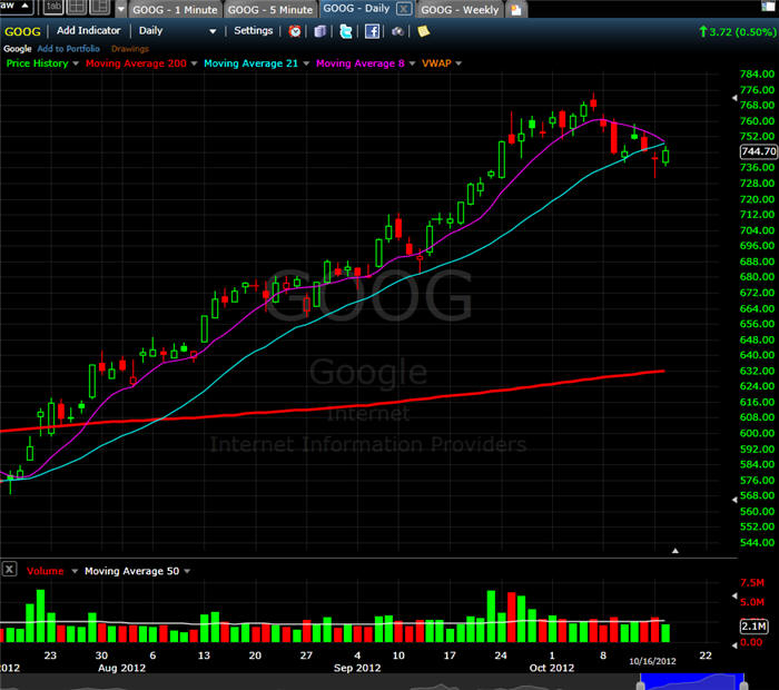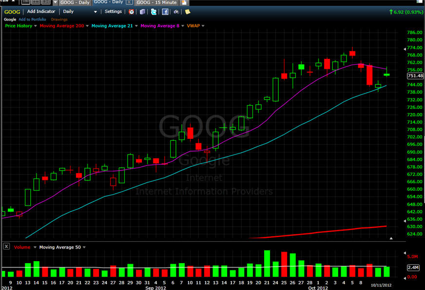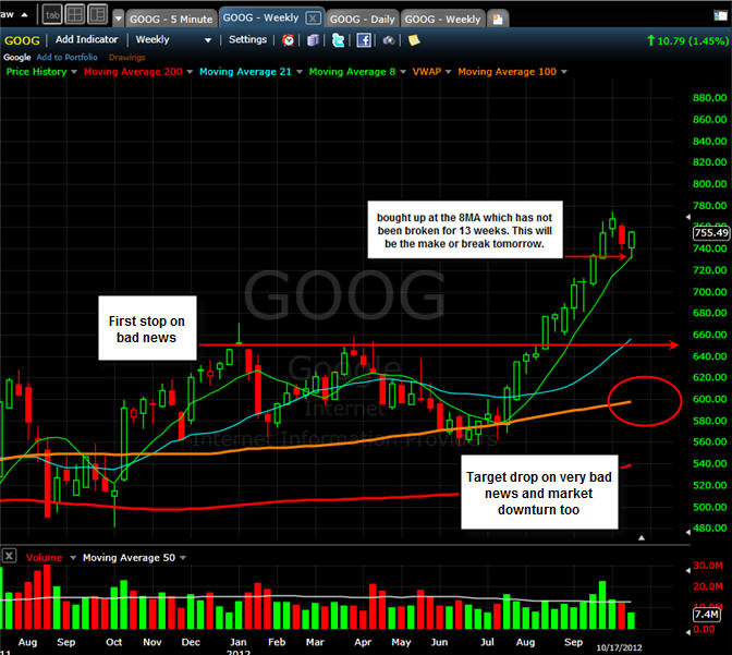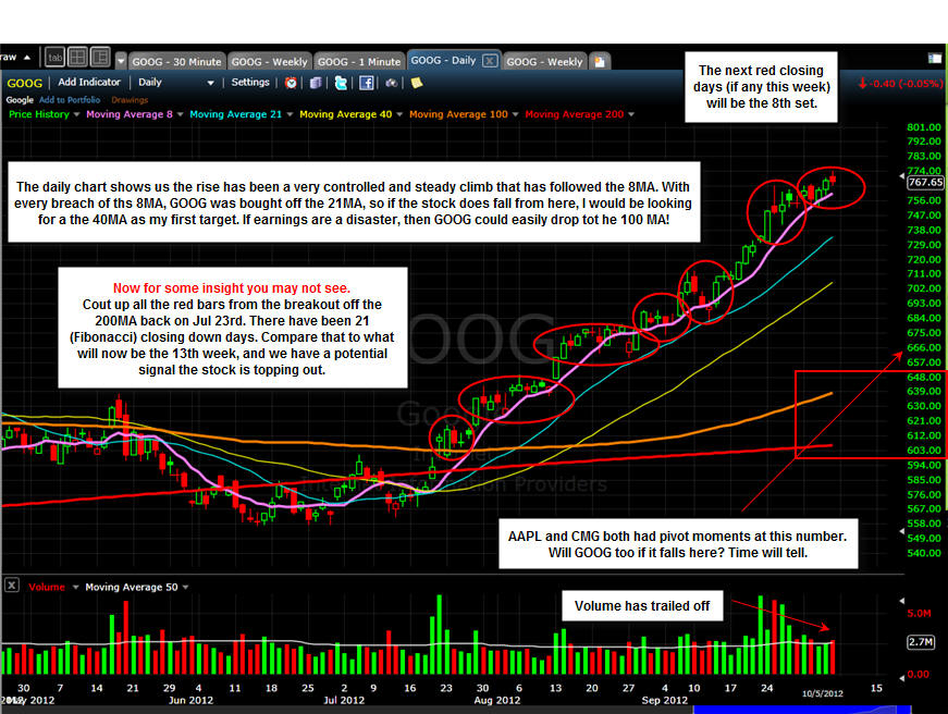 ================================================================================================= 10/11/12 - Test, bounce, fail? GOOG did not make the drop to the 8MA on the weekly chart; which is what I would like to have seen yesterday, instead, it made the daily 21MA the battle ground; however, today the 8MA on the daily chart was the stopping point.