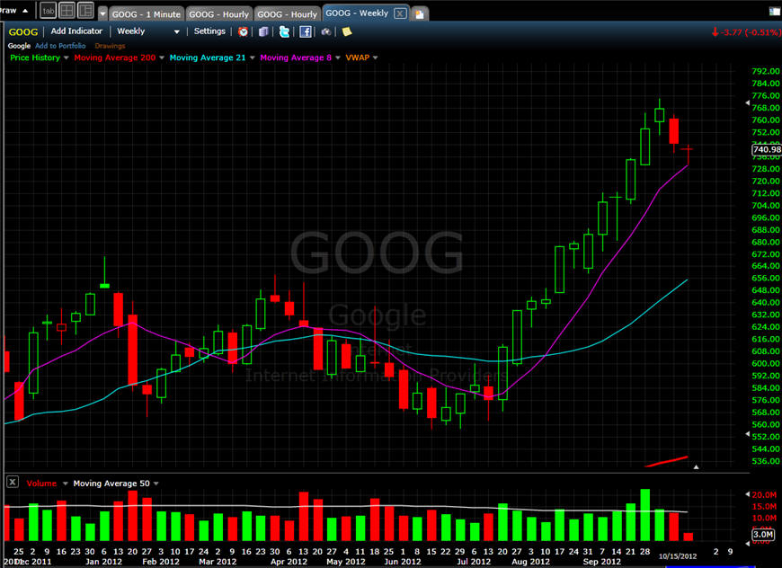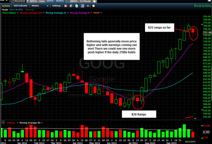 10/15/12 - The week has started and GOOG is stuck in the horses stall with a hangover. The markets were up today and GOOG gapped down; however, it did find some footing and managed to move over VWAP and closed with a strong move in the last hour; however, the stock still closed down on the day. The daily and weekly chart shows a long tail Doji, so it's anybody's guess where GOOG will settle in by Thursdays earnings release.