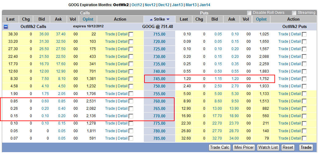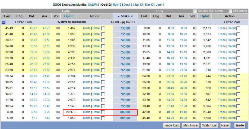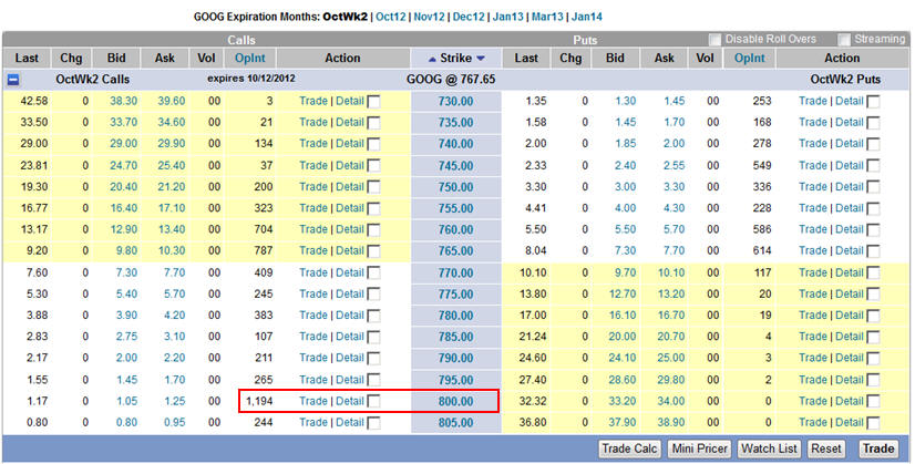 10/14/12 - As the weeks starts out, I will be watching GOOG for my entry for what could be the biggest Lotto Play I have picked this year! The best thing we could hope to see is for GOOG to hold the line at the daily 21MA and quickly race up to the all time high at $774. If GOOG does open up tomorrow and holds the open by 7am, then I will buy 1 Nov 800C as I see there are 17K 810's which indicates major resistance so I want to be assured I will be in-the-money should GOOG make its move to the upside. I will have my puts in place for the weekly on Wed or Thursday so be sure to check back regularly.
