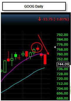 As you may know from my training sections, I have always said that Entry is Key...Exit is Everything TM and with that said, you have to know where to place your trades in order to get the most profit potential. The way we do this is to follow the money on the call side and buy puts above the closest major moving average (100MA or 200MA) on the daily chart. Because we speculate with weekly options that typically expire the next day or two, we must be in-the-money (ITM) to assure we can get a fill on all of our contracts and lock in massive profits. When a stock like GOOG gaps up and rises on earnings, it's typically around 8-12%, but when they get whacked, it can easily be 15-50% depending on the severity of the news event.