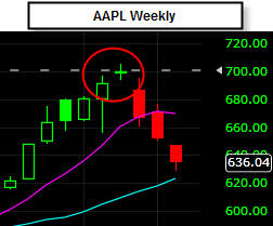 ====================================================================================== 10/9/12 - So far this weeks trading for GOOG has been a carbon copy of AAPL's fall from investor grace. If you look over the Daily chart then you can see another (weaker) Evening Star Doji pattern that is proving to be most reliable for bearish reversals.