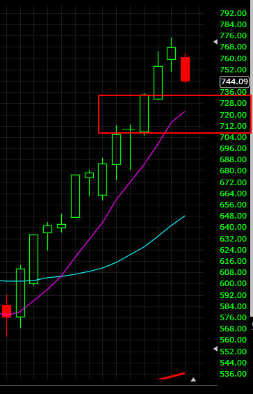 With earnings coming next week, GOOG could be taking a breather before making one more push higher. As I pointed out below, this is the 13th week from this massive run up so its almost a given that GOOG would pull back. With today's solid drop (meaning no real topping tails) I am expecting GOOG to make a move down to $720 tomorrow to test the 8MA.