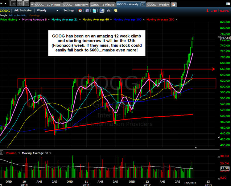 10/7/12 - The big day for GOOG is fast approaching (10/18/12) and we will stand ready to make, what I hope, is a massive profit yet again on one of my Lotto Trades!