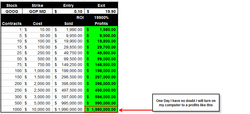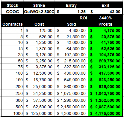 Will this be the case for GOOG? I do not necessarily think so. After all, by comparison, CMG is a "fast food" company and well, GOOG is the 5 star class envy of the all-you-can-eat technology buffet! There are too many things going on with this company to leave anything to chance; and with the future of internet technology being pre-set by them, well, the universe is no limit...or so is seems to anybody in the investing world. So, with that being the criteria, it is definitely looking like GOOG may become the Berkshire Hathaway of the Tech stocks. Question is, will they split their stock or NEVER split it just to prove a point! I plan on making a fortune with Lotto trades as stocks like GOOG march on into the history books. I hope to make some of my own history that started me off on my Lotto Trade strategy back in 2006. The trade below was one I posted to this site more as a jest of "what if". I did not do this trade, instead, I did a trade on AAPL with my then $8k trading account. I made a very nice $5k profit that week, but WOW, what could have been changed my point of view on trading short-term options forever.
