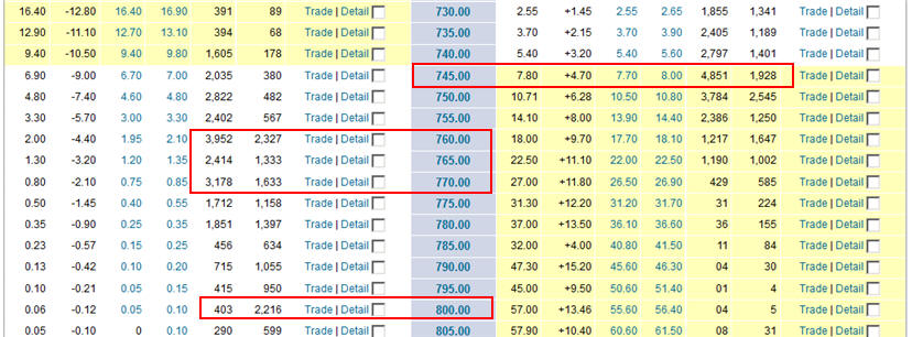 Looking over the options for the October monthly expiration, we see there is a massive amount of open interest at the $800 strike—this will be the battle ground for the stock this week if it rises to the occasion.