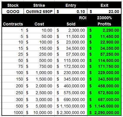 When I see stocks with 3 or more days to cover, that is when you get a larger measured move on an earnings blow out. Currently, there is not that many investors who think GOOG will be heading lower anytime soon. This is where you have the potential to make a fortune on the puts if they disappoint by a wide margin. I will be watching the $675-$690 puts as we get closer. I hope GOOG heads higher this week so these puts get really cheap ($0.10 cents cheap) because if GOOG drops like CMG, did we could have a massive Lotto Trade winner! Here is the potential if I am right? I will be watching this stock closely all week and tracking the open interest in the options for clues to what strike price I think will give us the best opportunity to profit from.