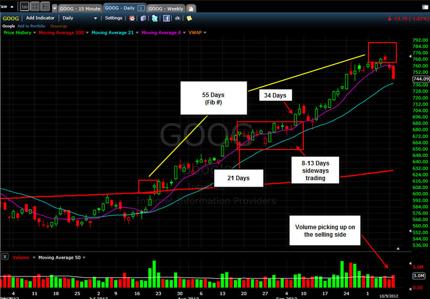 Here is an interesting tidbit for you to look at. As you know I love to trade around the Fibonacci numbers and I look for them at pivot points. Well, here is confirmation for you! Once GOOG broke above the 200 MA on the it has reversed course exactly 55 days later.
