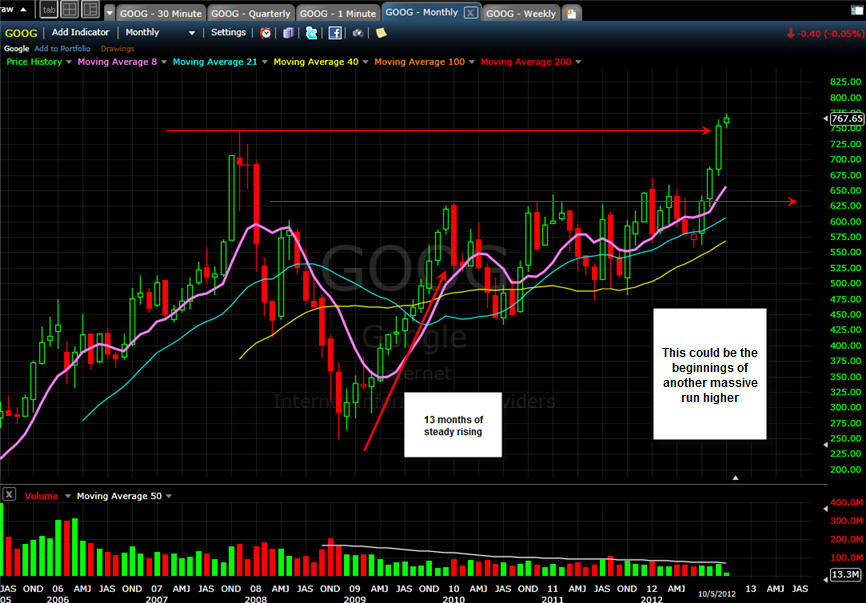 GOOG is looking like it could become the stock of the year as it beats out AAPL for top spot by 12/31/2012. Looking over the massive momentum in this stock the last few weeks, there should be a measured move on a beat and a major drop on a miss. Of course, we must be on both sides of this trade, so the key here is picking the correct strike prices.