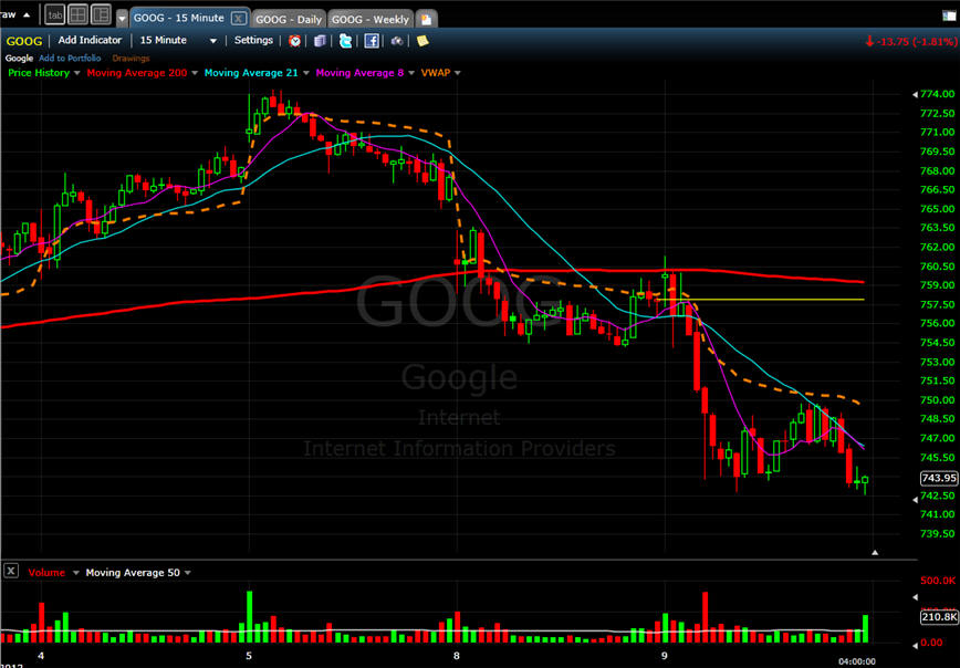 Here is the 15min chart. Notice how VWAP was resistance all day and actually for the past three trading days. Once GOOG gets back over VWAP I will look for long positions.