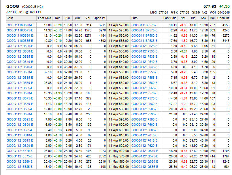 4/11/11 - It's time to straddle a lotto play on GOOG. Options expiration is Friday and GOOG has been on quite a nice run for the past couple of weeks and now it's selling off a little bit ahead of upcoming earnings. With all this buying activity, I suspect they will meet or beat earnings on Friday. I am going to do a straddle and I am sure I will be nicely rewarded on this awesome stock!