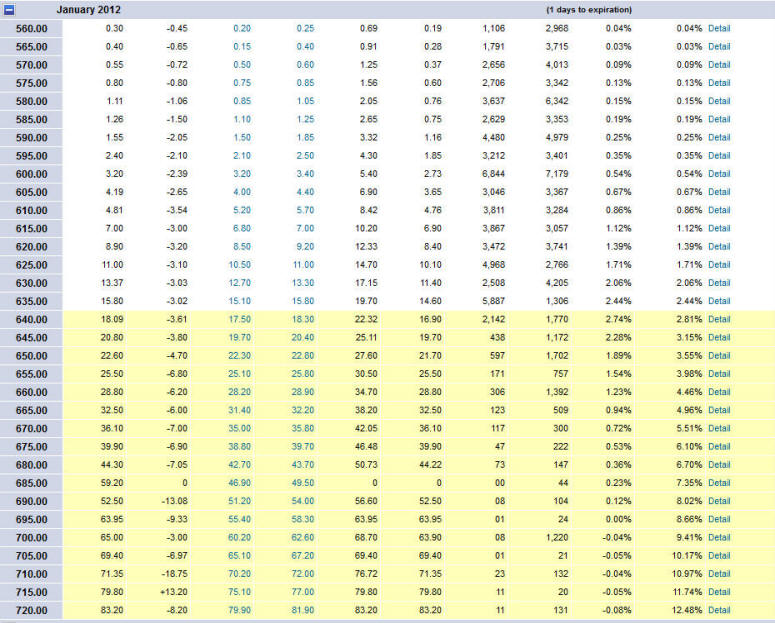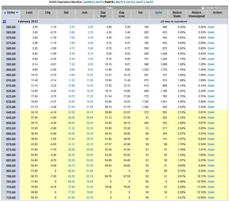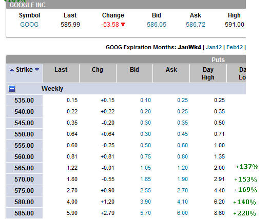 As you can see, GOOG attempted to put on some higher ground into the end of the year, but with a failed pre-earnings run it could be the time to strike gold with puts. Of course you have to do a straddle unless you just want to gamble so here is what I suggest.