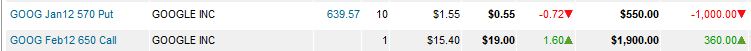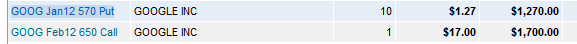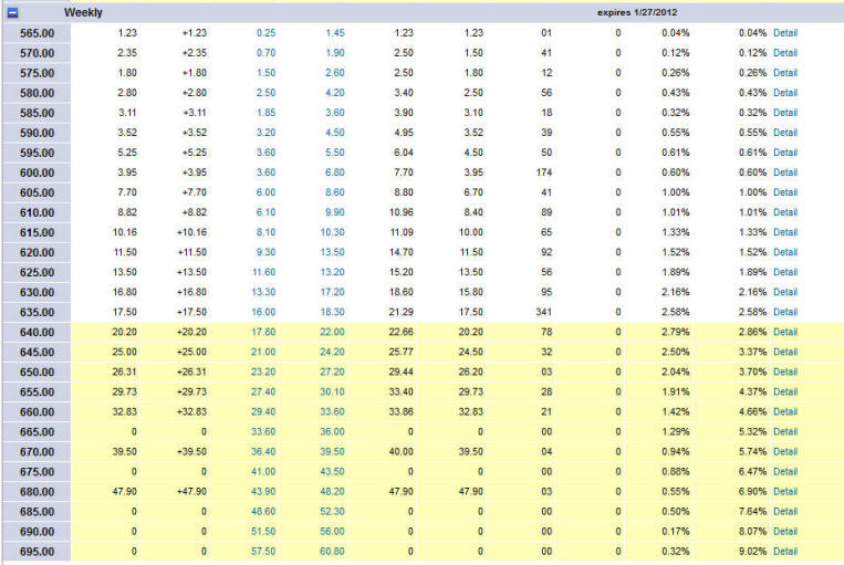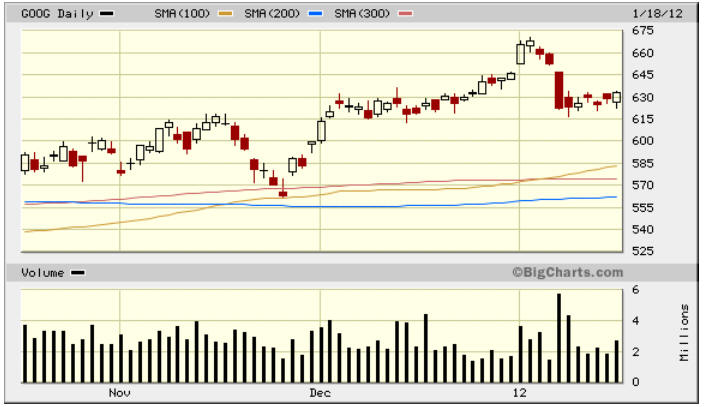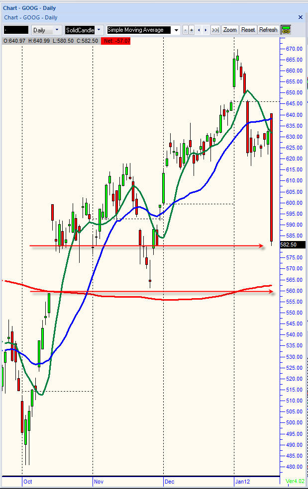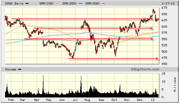========================================================================== 1/17/12 - It's time for GOOG earnings and a potential HUGE profit. Looking over the chart we can see there are good opportunities and true to form, GOOG will announce on Thursday the day before options expiration!