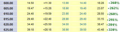 This did not turn out as well as I was expecting it to. The volatility was well priced into the options this time so unless you were able to short the stock you would have had to buy the 600-625 puts to get a better profit.