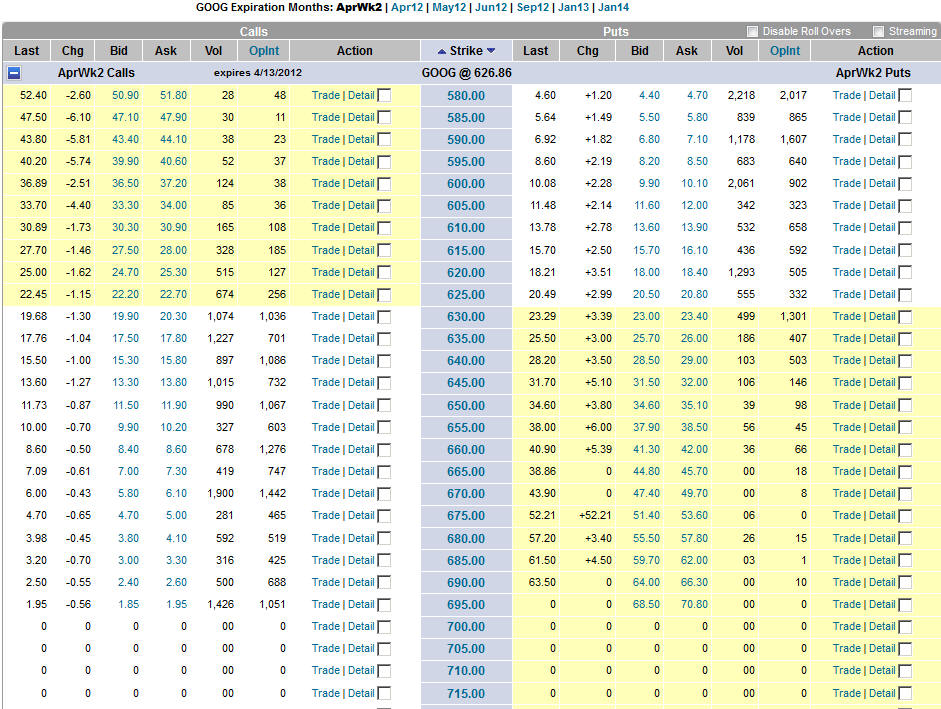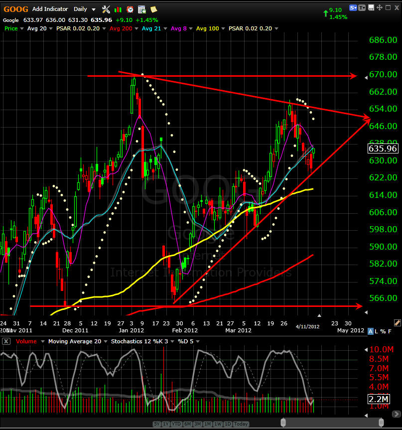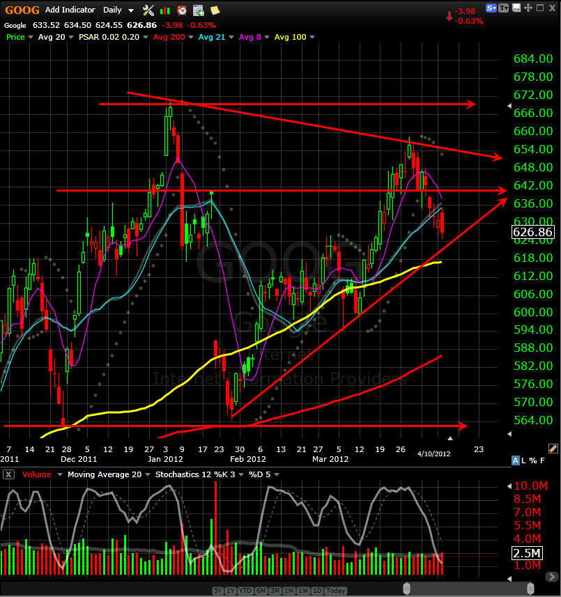 ============================================================================================ 4/10/12 - Thursday is the big day for GOOG earning to be released. The stock has been languishing around for the past couple of months and appears to have put in a possible double top on the daily chart. If you recall from our last play on this stock, the weekly puts paid off whereas the monthly strikes were too inflated with premium to make a huge profit. This time around, GOOG is announcing earnings a full week BEFORE expiration but true to form, they are announcing on a Thursday which means the weekly options are the Lotto play.