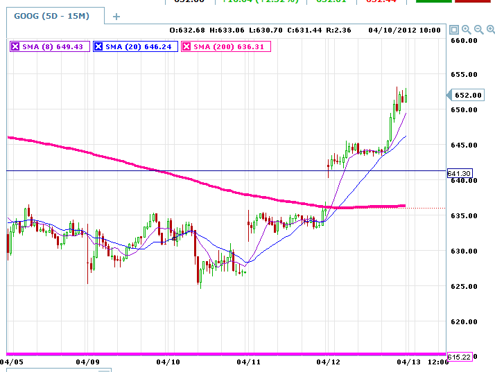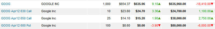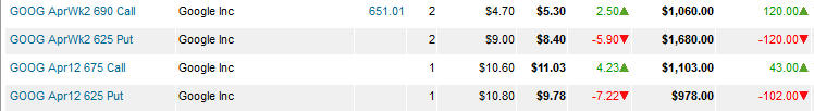 4/12/12 - GOOG announced better than expected earnings and a quasi 2:1 stock split in the way of a stock dividend without voting rights...huh? Top that off, they actually missed revenue projections slightly so all this has led to confusion and in some circles already becoming seen as a very BAD move for long term share holder growth. Needless to say, the stock popped, dropped and normalized in post market. It's looking like this stock may end up trailing down as time moves on and with our current options plays, I do not see a massive profit tomorrow. The past couple of days this stock has run up briskly, so there is not much interest to propel it higher now that they have confused investors.