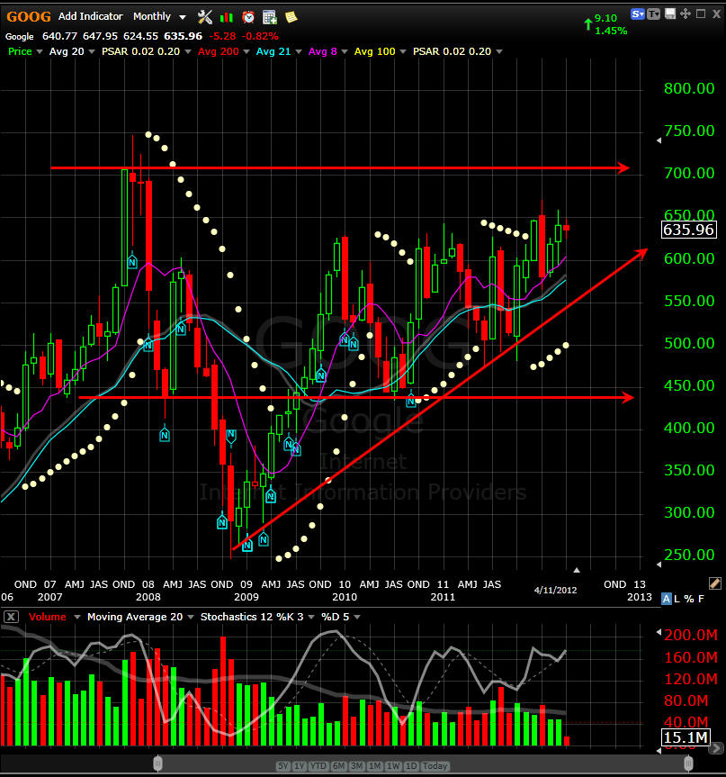 4/11/12 - Tomorrow is the BIG day for GOOG and the markets. If they announce as expected, then most likely the stock will continue to languish and or sell off some more; however, if they disappoint, it's going to be a great day for PUTS and if they surprise then the rise can be dramatic. Hey, maybe they will even announce a stock split? The stock was recently upgraded to a price target of $850 and with the Motorola Mobility merger coming to a finality, there will be a lot of future profits to build upon going forward. Noteworthy news was the changes to their ad revenue generating model which needs to show marked improvement from last quarters revenue. Option buyers are speculating around a 6% move in the stock, so there will definitely have to be a surprise to move the stock over the 52 week high of $670. Speaking of highs, GOOG is actually down slightly from a year ago this time. The monthly chart shows some potential to move higher and things will be interesting if they do surprise.