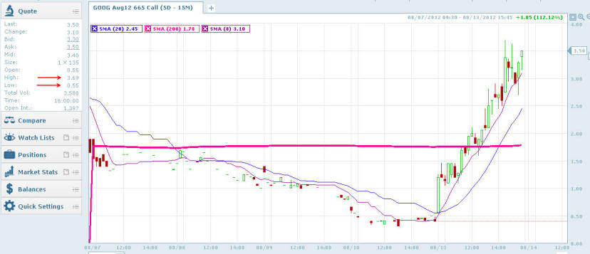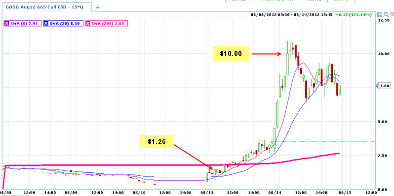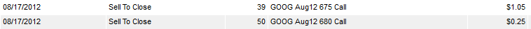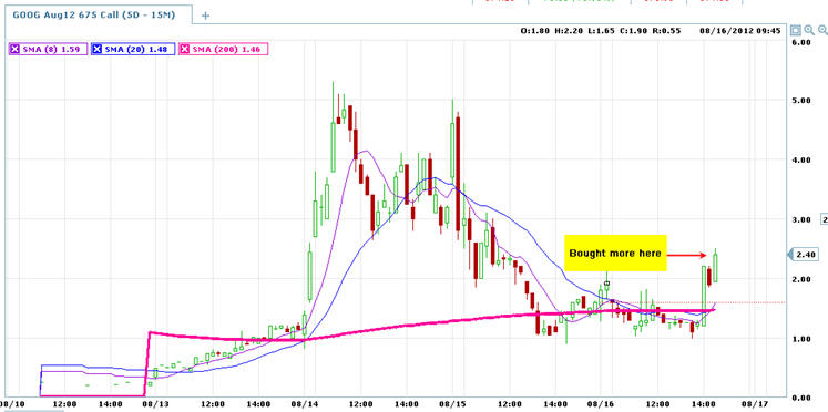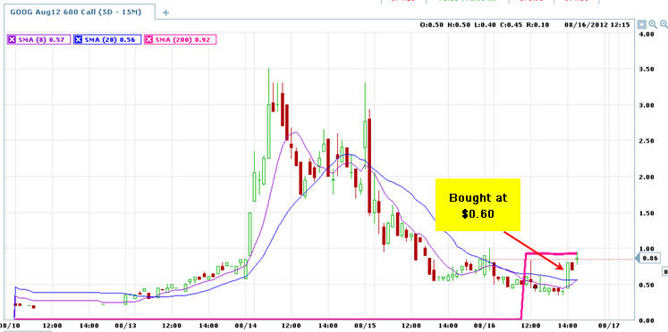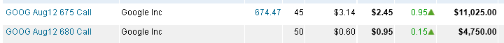 8/15/12 - Google is holding ground today which is a good sing for a move higher by Friday. I will be watching tomorrow for my next Lotto play entry. If GOOG opens higher than $675 tomorrow, then I will look at the 685 calls.