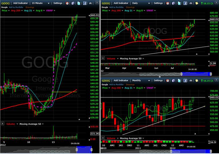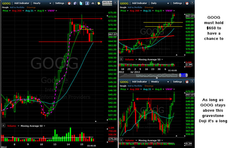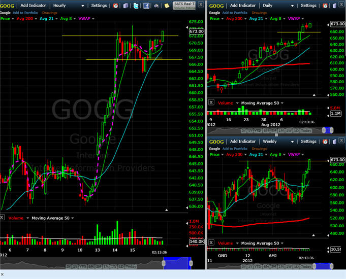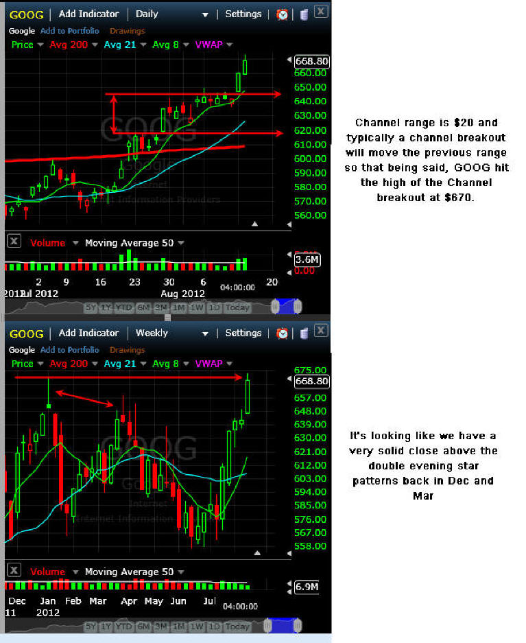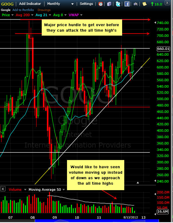 8/13/12 - Looking over today's action makes for a good case that GOOG could take out its all time high of $747 soon. It has been a very long time coming and with all the enthusiasm in "tech" stocks these days, I certainly can see GOOG making a run for the higher ground. Today, was a very good day to be long this stock, so I am looking for an opportunity pull back before I get in with a full position. If the stock does gap up tomorrow, I will buy a small position on any dip that holds above the open. If GOOG does get a close over $670 on stronger volume than today, the race is on to take out the all time high!!