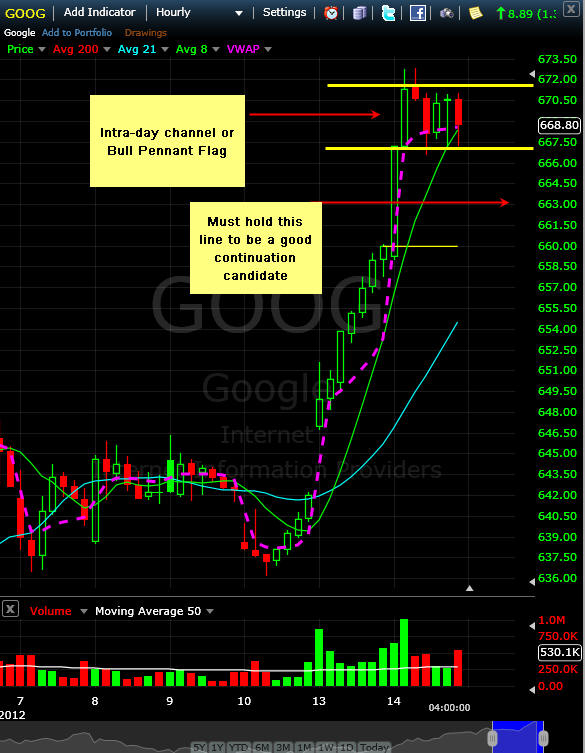 Here is the hourly chart for today. Notice the solid gap up then increasing volume after lunch. This is very bullish; however, the stock must hold $663 for me to consider it a continued long.
