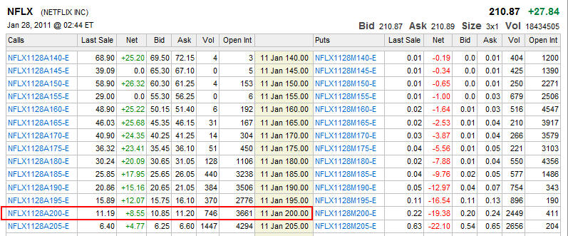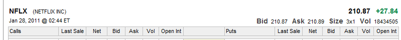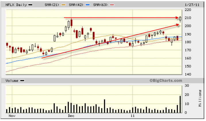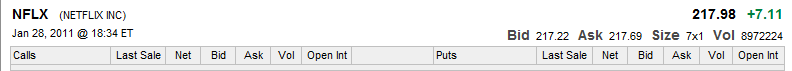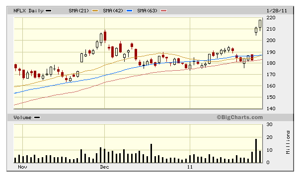 1/10/11 - Today the lagging stopped and NFLX put on some nice gains. There was a bullish report from Goldman Sachs analyst Ingrid Chung most likely giving fuel to the fire today.