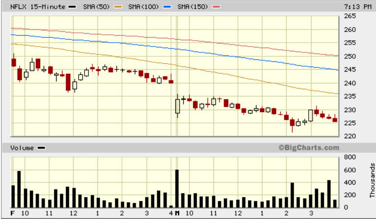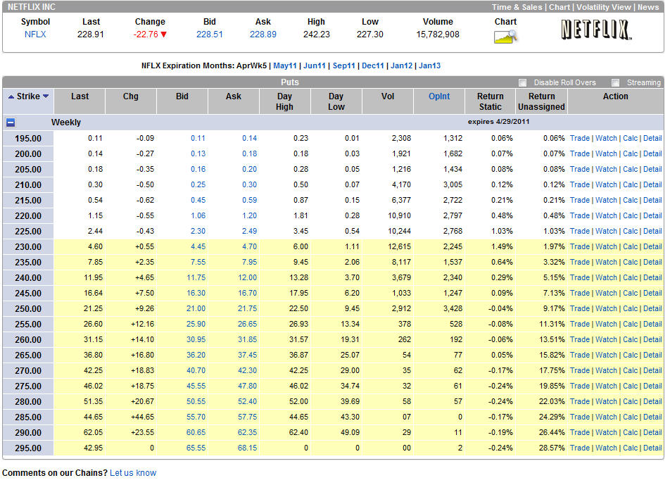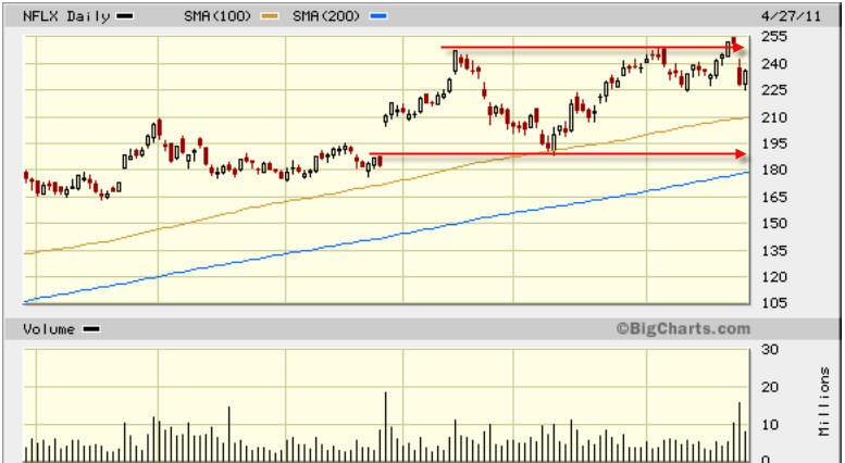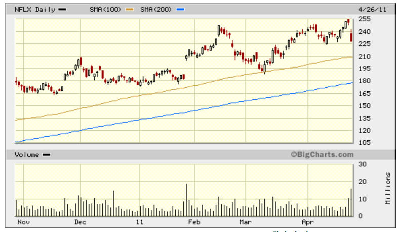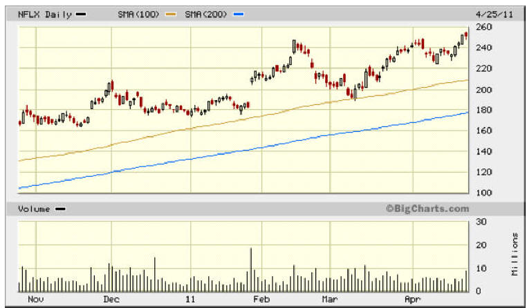 4/25/11 - NFLX beat earnings but the response was lack luster and with the CEO lamenting that new subscriptions could be on the decline coming up the stock was sold in after hours. This is a classic "sell the news" event that should continue for a couple of days to maybe even a week. If the overall markets take a turn down the NFLX will accelerate into the 100 MA and possibly the 200 MA at $180. The Lotto put plays listed will make profit, but certainly not the massive ones had NFLX actually disappointed.