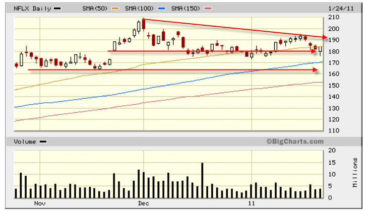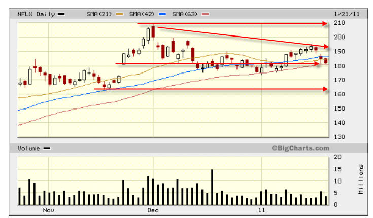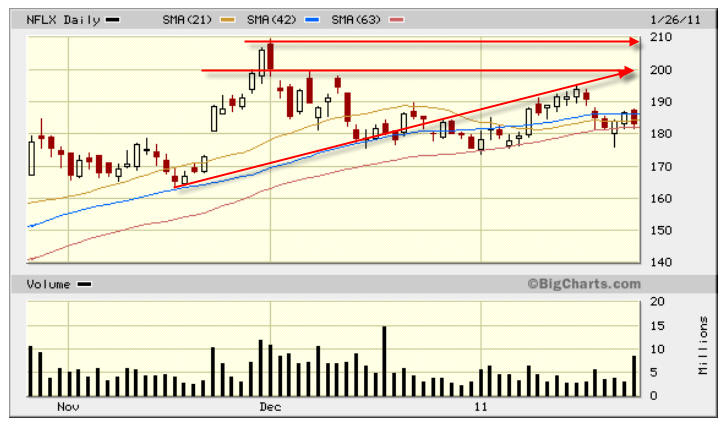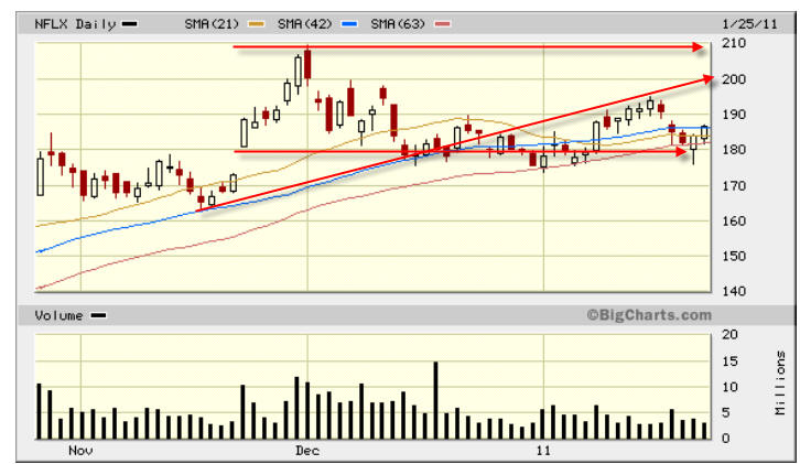 1/7/11 - New year and NFLX is lagging with the market. Looking like it may make another attempt at the all time high since the bap from Nov is holding up; however, I am not a total fan of continued upside as competition continues to come on line. I even cancelled my subscription today because I am just movie burned out and they raised my rates to offset continued bandwidth demands with the online viewing. There are more and more movies coming on line to watch so we will have to see in the next earnings report if the price increase helped or hurt subscriptions. I can assure you that when subscriptions suffer this stock will pay us off with puts!!!